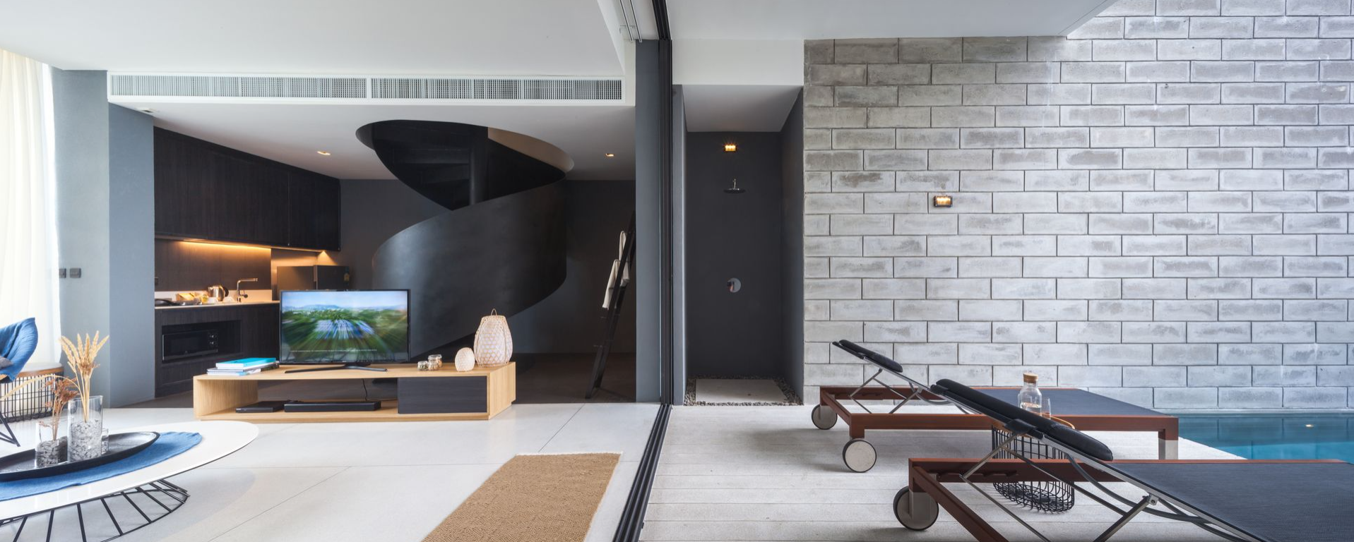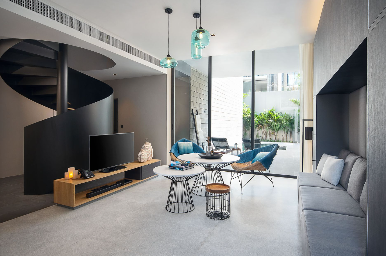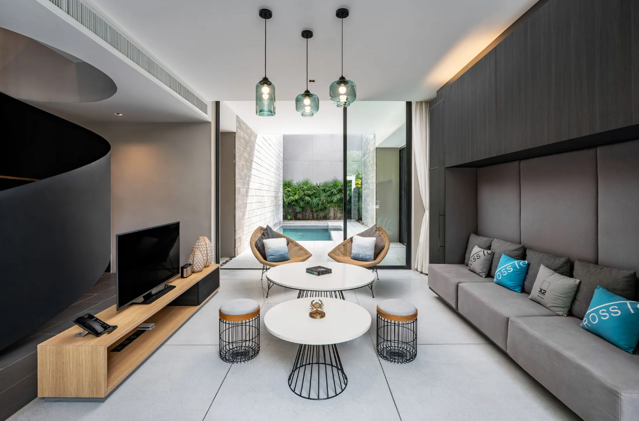 2베드룸 풀 빌라는 4인부터 최대 6인까지 숙박하기에 이상적입니다. 나선형 계단이 넓은 거실 공간과 침실을 연결하고, 전용 수영장 데크에는 휴식을 위한 일광욕 라운저가 마련되어 있습니다.