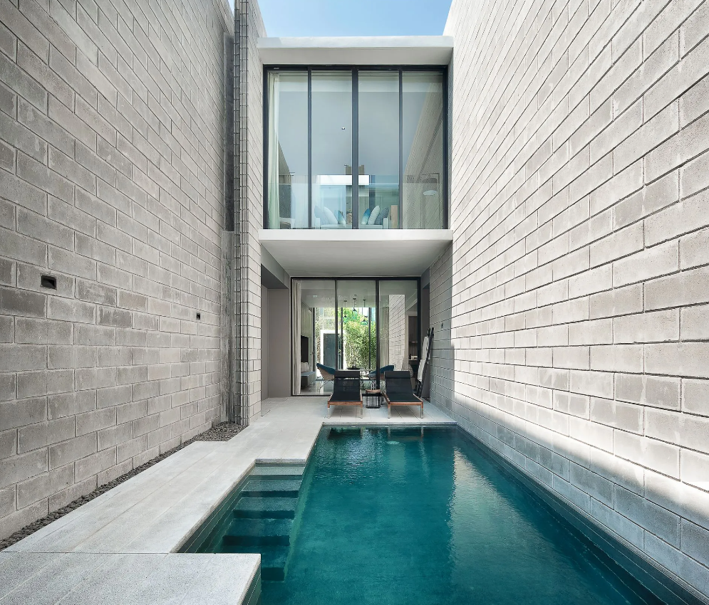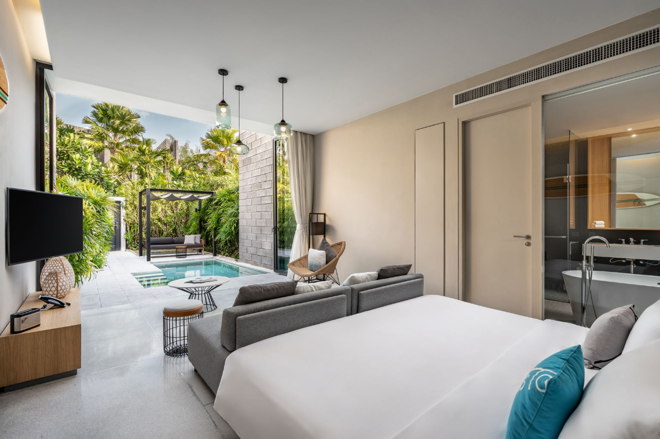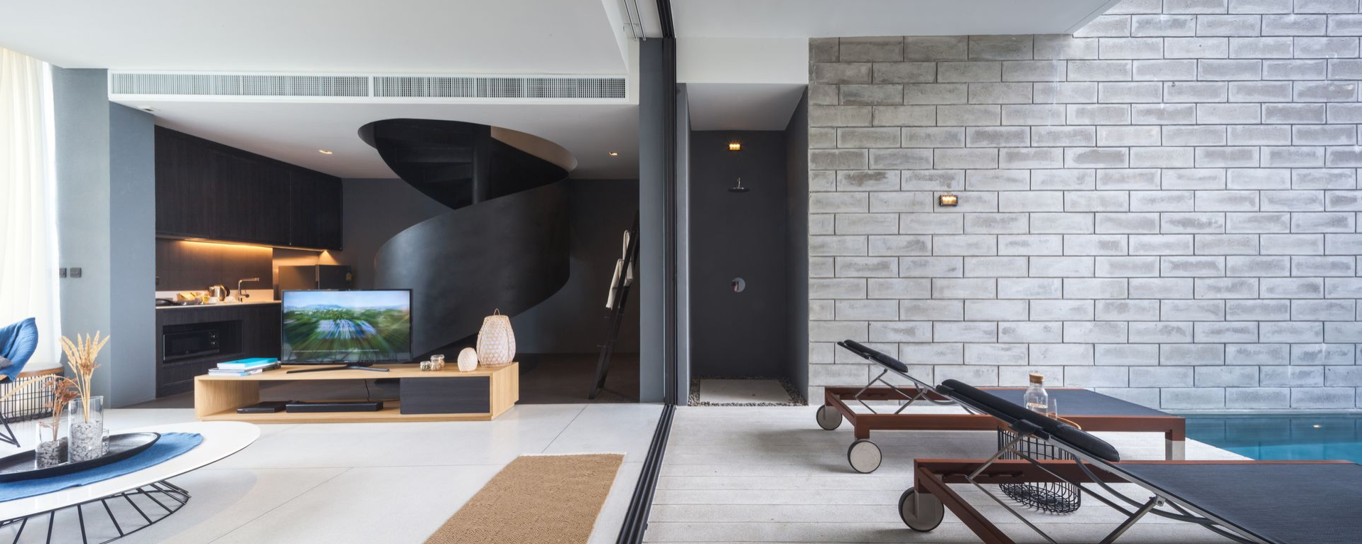 2베드룸 풀 빌라는 4인부터 최대 6인까지 숙박하기에 이상적입니다. 나선형 계단이 넓은 거실 공간과 침실을 연결하고, 전용 수영장 데크에는 휴식을 위한 일광욕 라운저가 마련되어 있습니다.