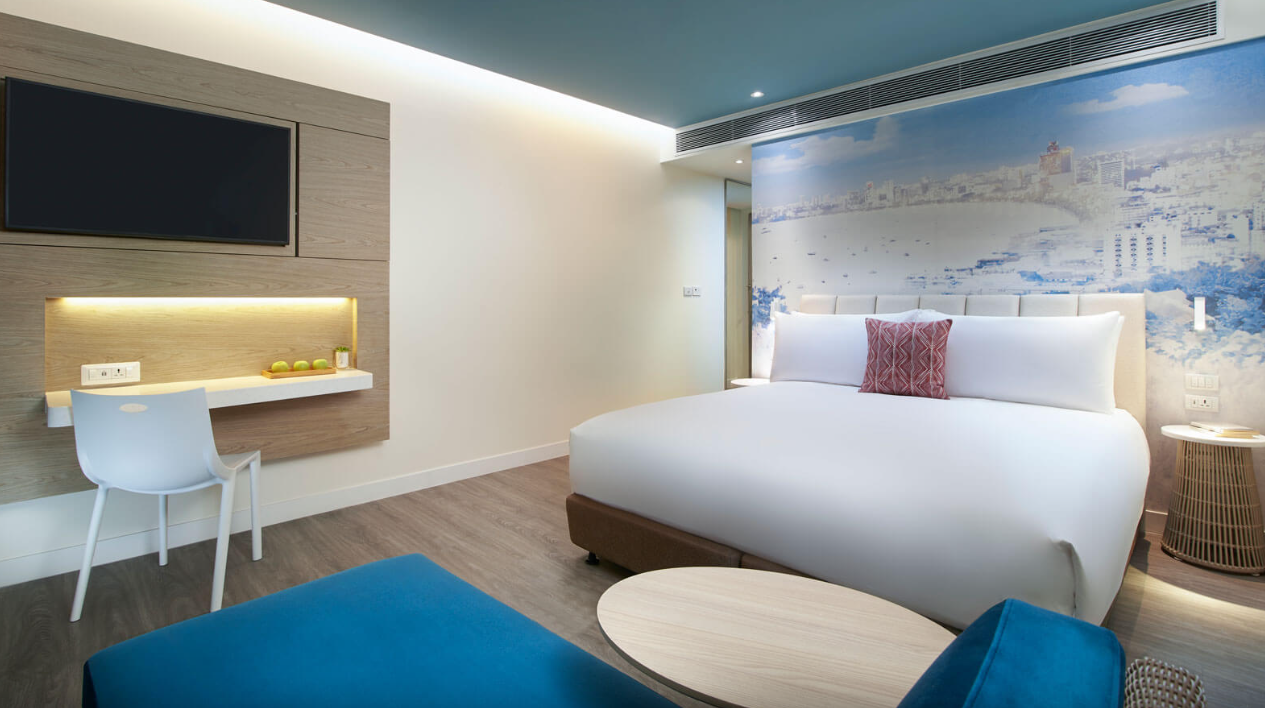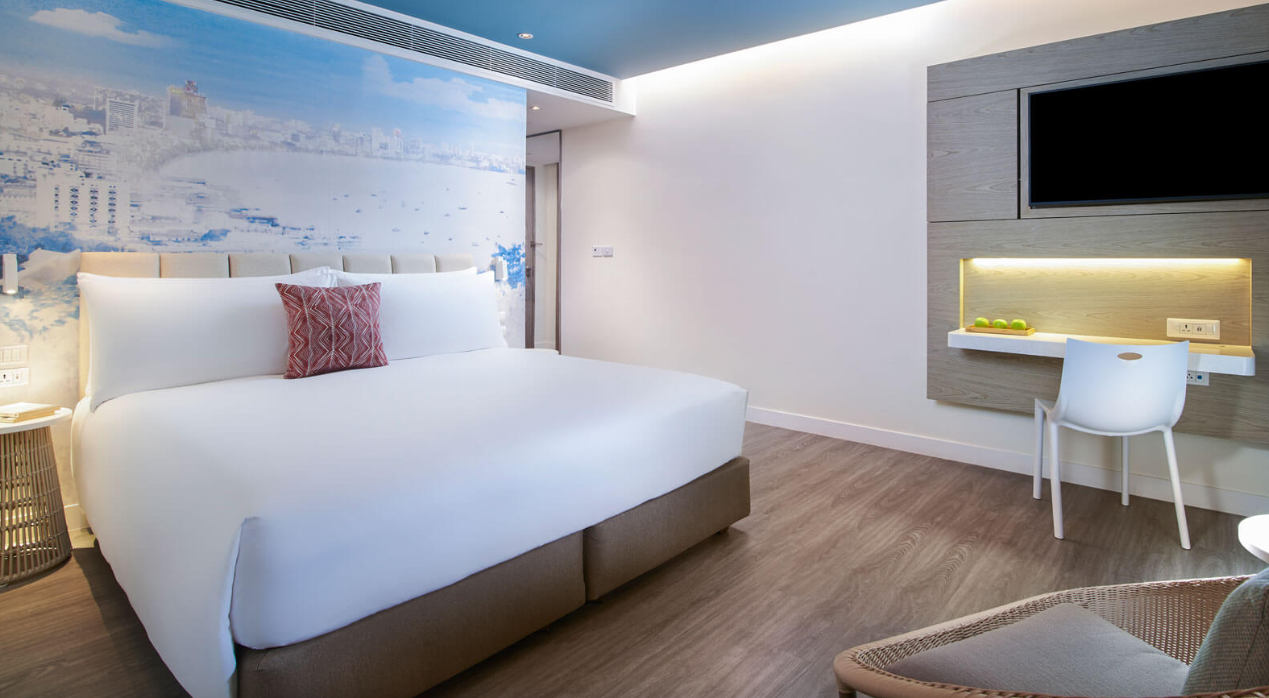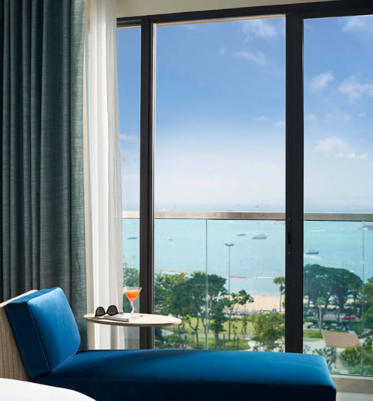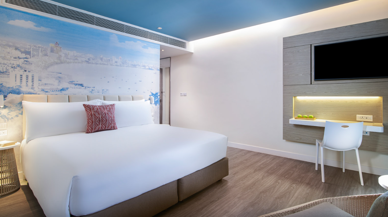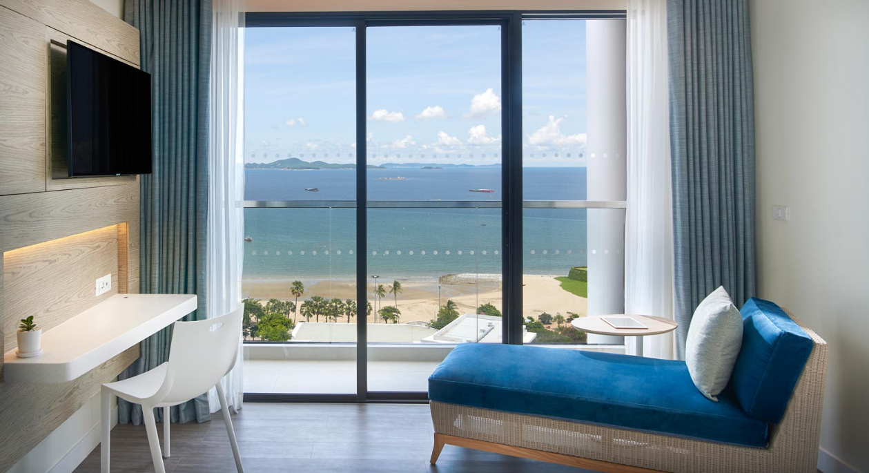 파타야 해변의 멋진 전망을 감상할 수 있는 전용 발코니, 데이베드, OZO 시그니처 침대를 갖춘 디럭스 오션뷰 객실에서 재충전해 보세요.