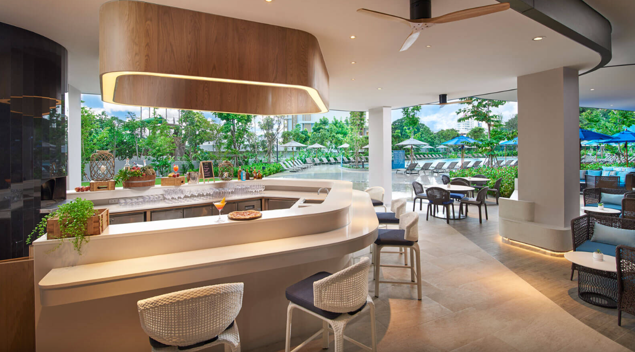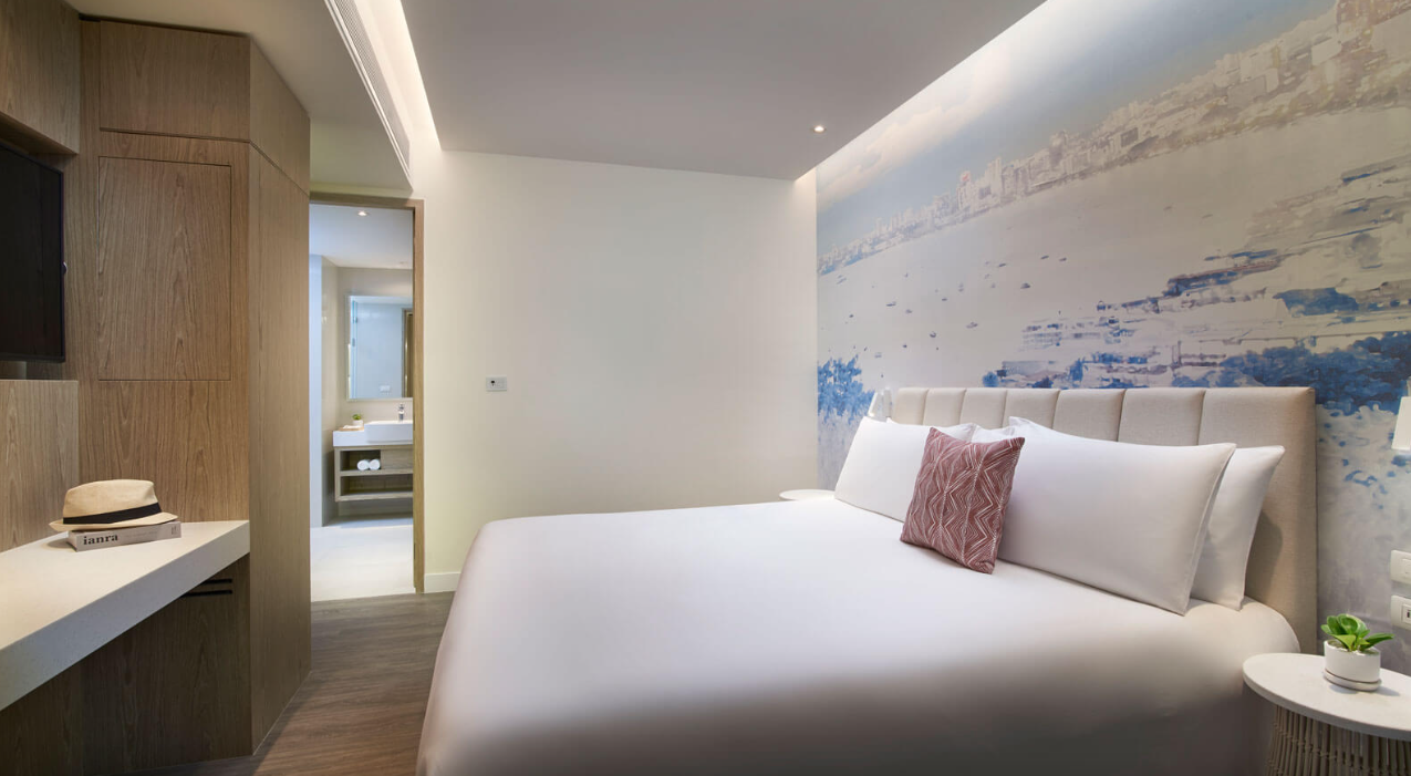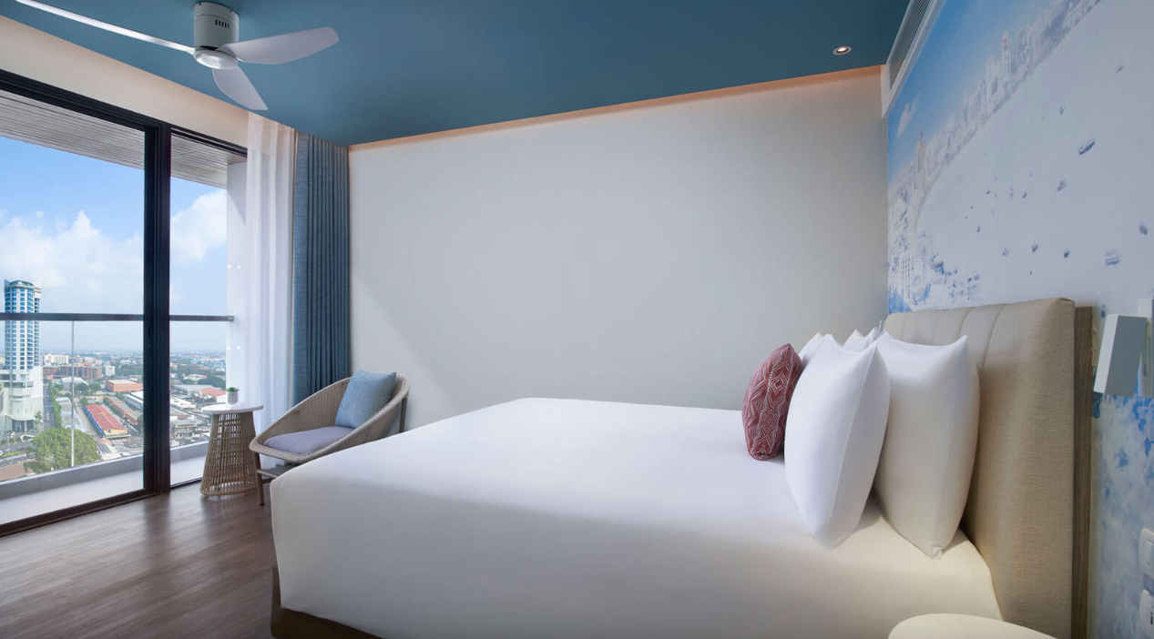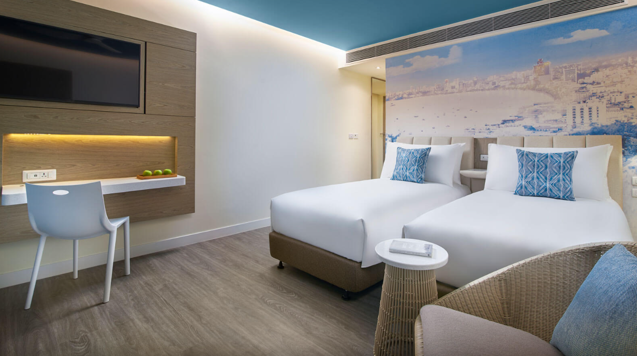 파타야 해변의 멋진 전망을 감상할 수 있는 전용 발코니, 데이베드, OZO 시그니처 침대를 갖춘 디럭스 오션뷰 객실에서 재충전해 보세요.