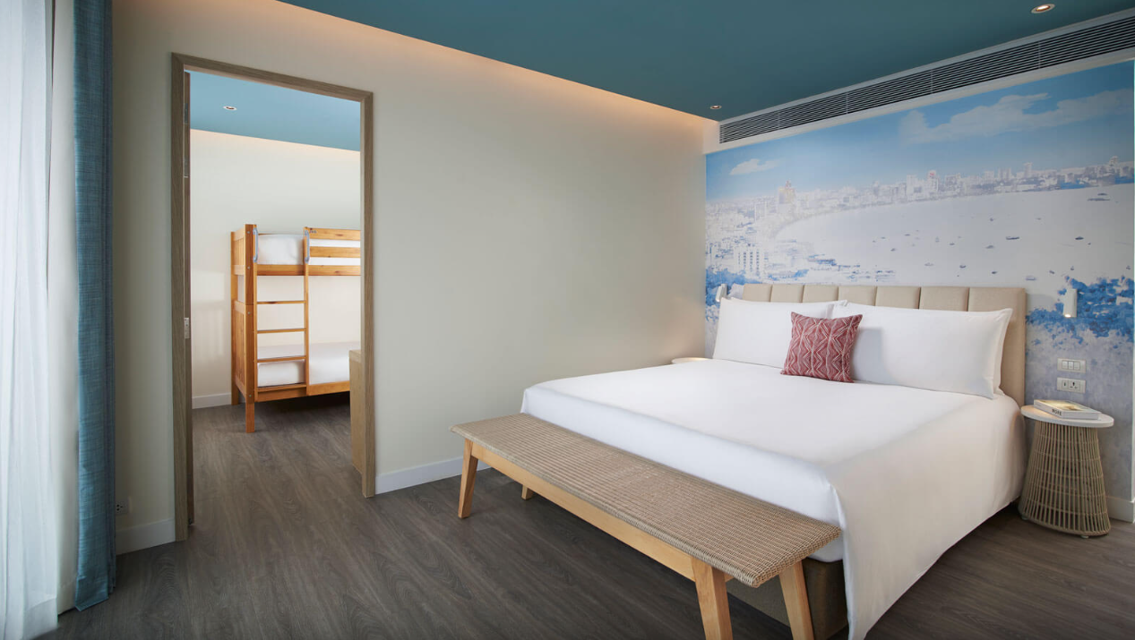 편안하고 휴식을 취할 시간이 되면 디럭스 2베드룸이 나만의 안식처가 될 것입니다. 북부 파타야 리조트의 가족 친화적인 객실은 마스터 침실에 킹 사이즈 침대가 있고, 두 번째 침실에 어린이를 위한 트윈 침대가 있으며, 두 침실 모두에 평면 TV가 있습니다.