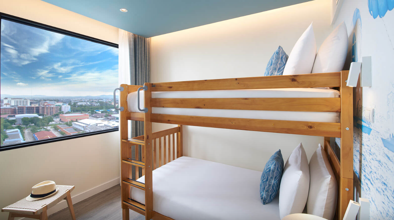가족에게 이상적인 북부 파타야 호텔의 슈페리어 패밀리룸은 멋진 킹 사이즈 침대, 두 번째 방에 있는 어린이를 위한 이층 침대, 암막 커튼 및 무료 Wi-Fi를 갖추고 있습니다.