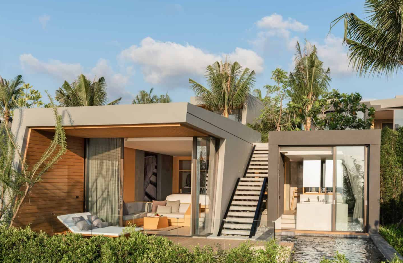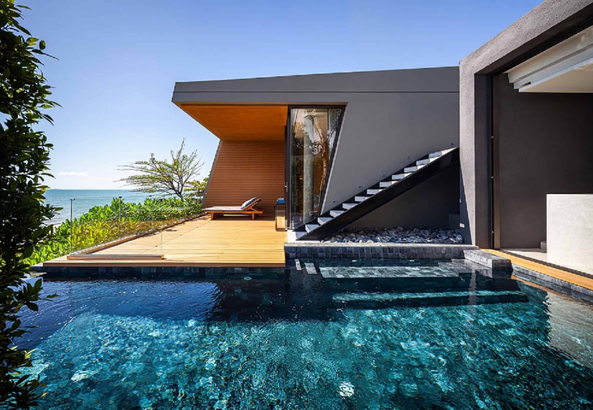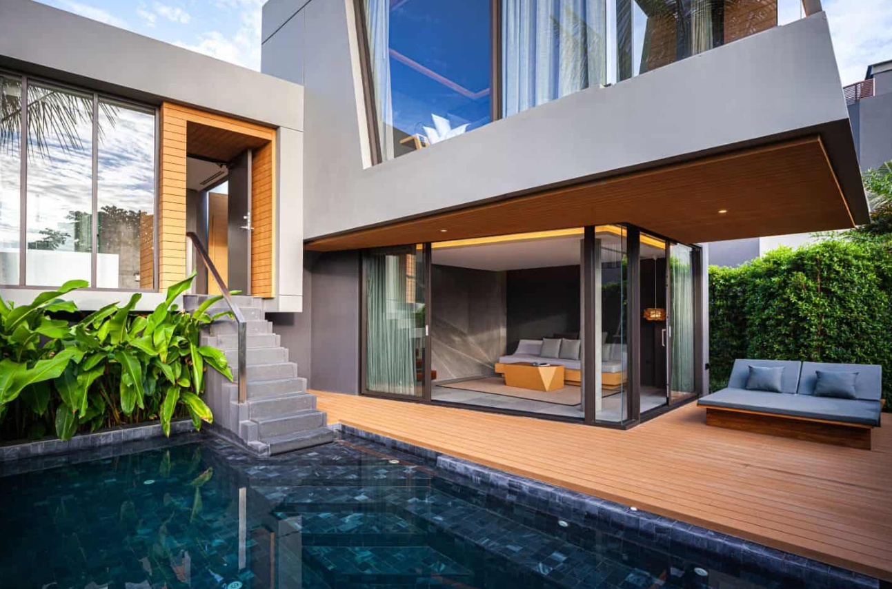 듀플렉스 그랜드 풀 빌라는 복층형 풀빌라로 빌라의 레이아웃은 거실과 외부 데크, 수영장이 서로 흐르는 듯한 느낌을 주어 공간감을 더욱 높여줍니다. 분할 레벨 디자인은 프라이버시와 절묘한 편안함을 제공합니다.