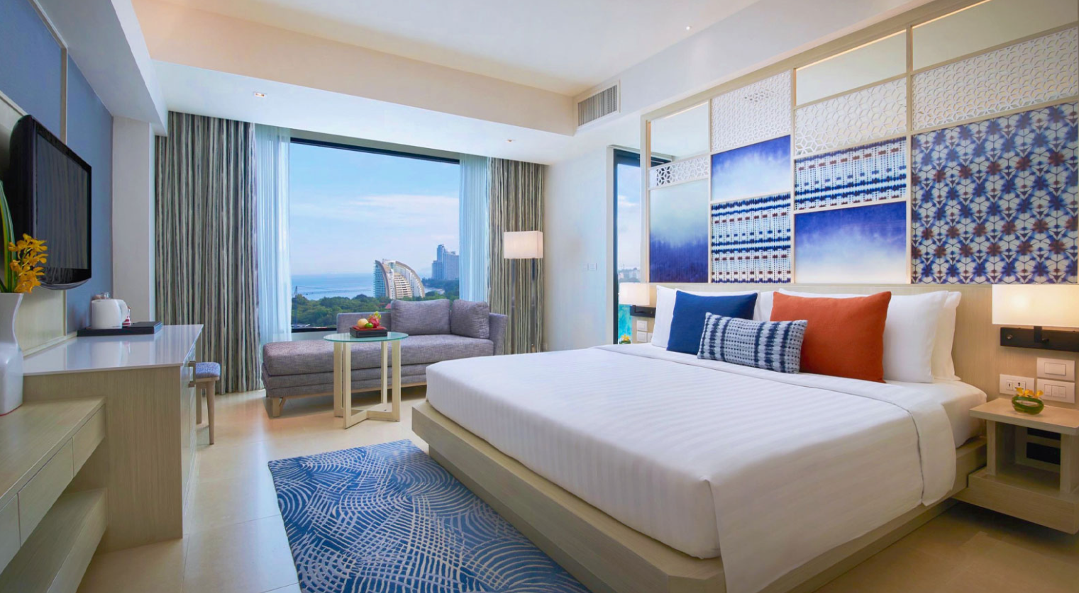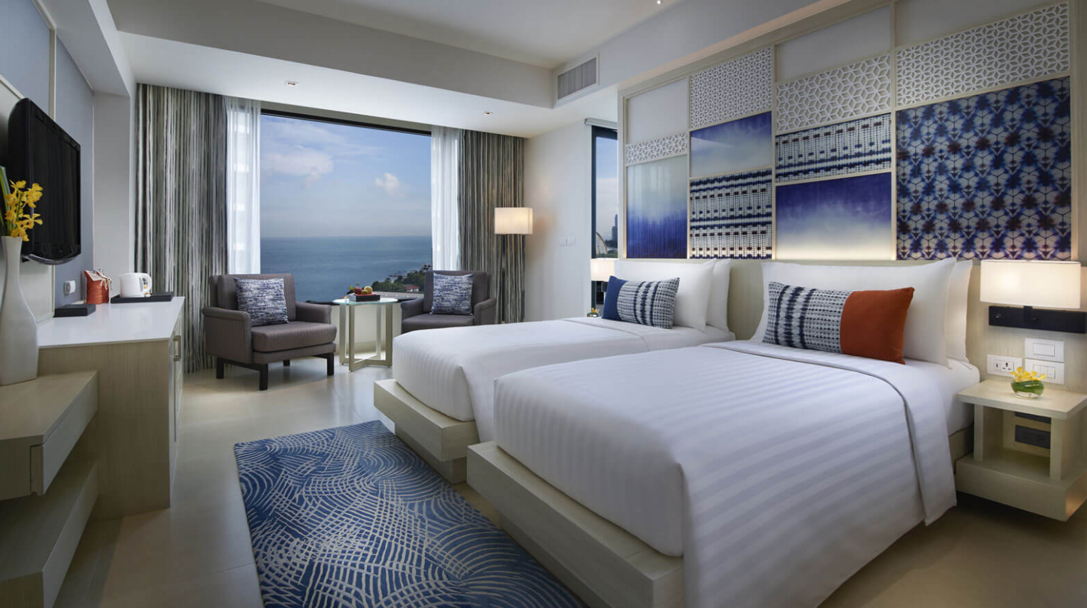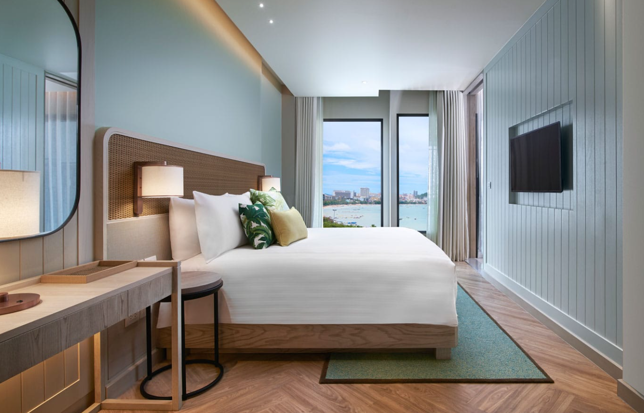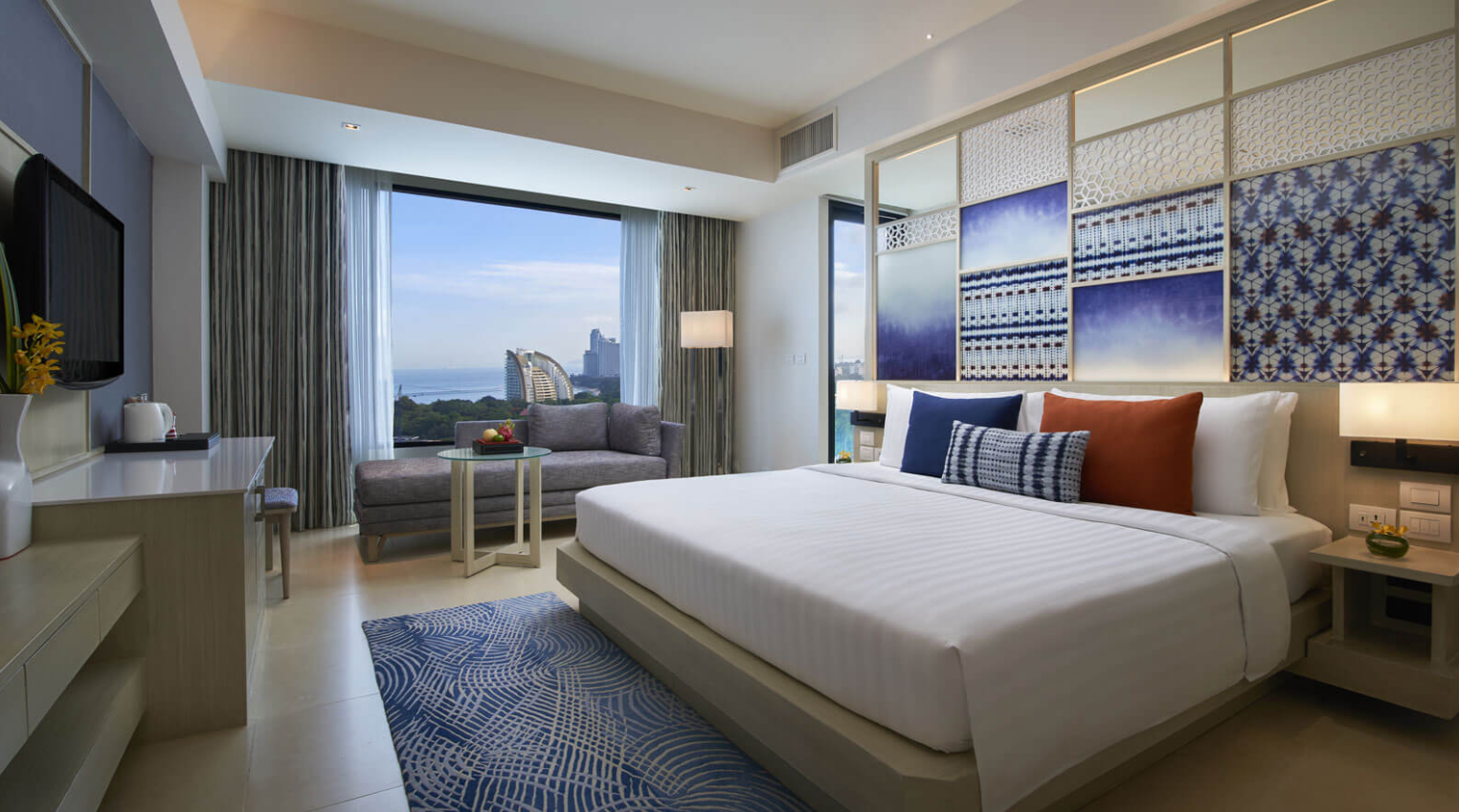 디럭스룸에서 바다를 바라보는 숙박을 생동감 있게 해석한 경험을 해보세요. 북부 파타야 리조트에 있는 친밀하면서도 현대적인 객실은 거실 공간, 업무용 책상, 파타야의 활기찬 분위기가 내려다보이는 발코니를 갖추고 있습니다.
