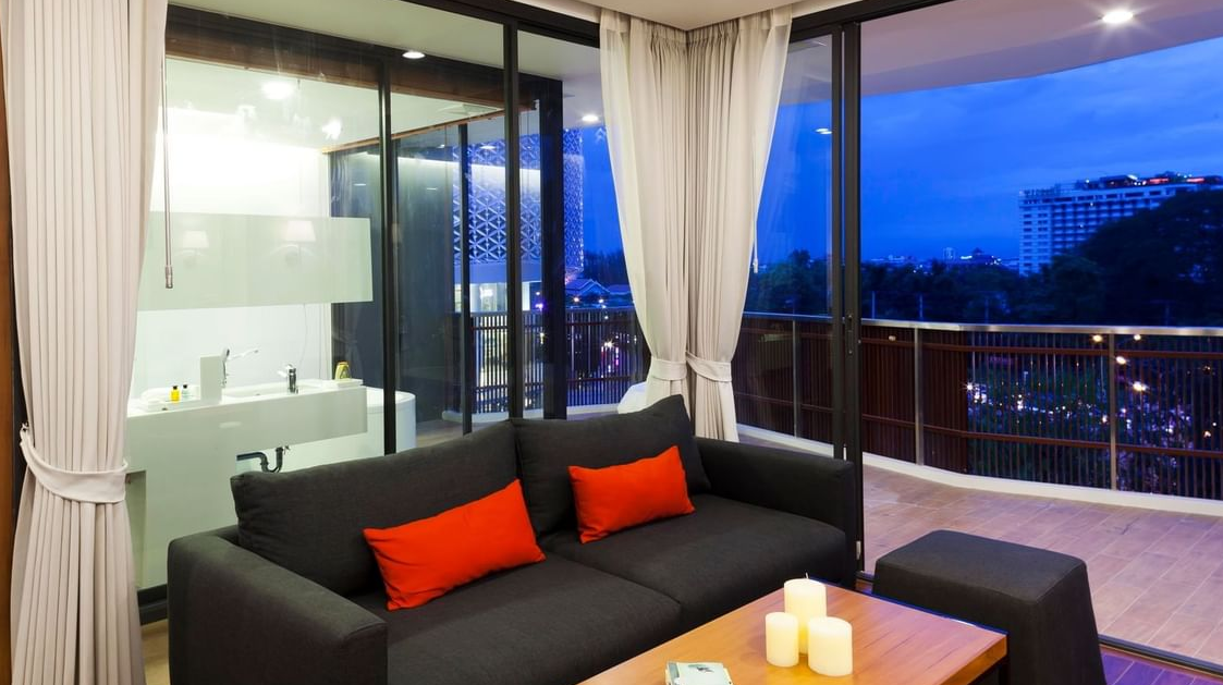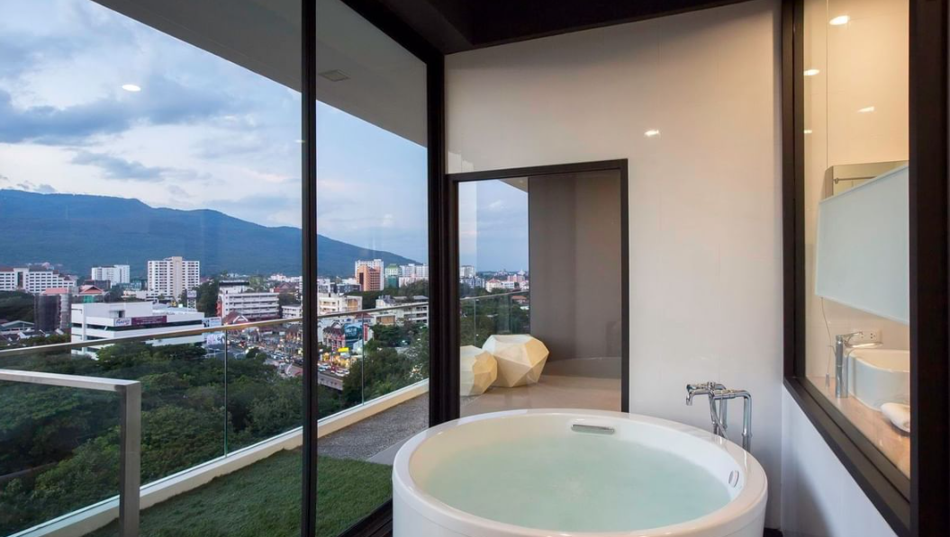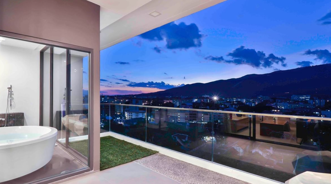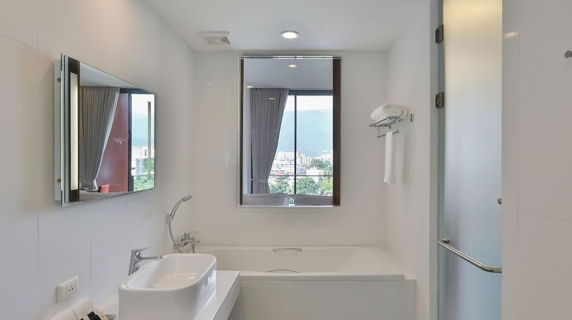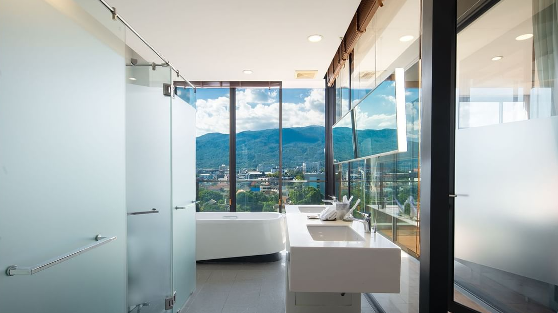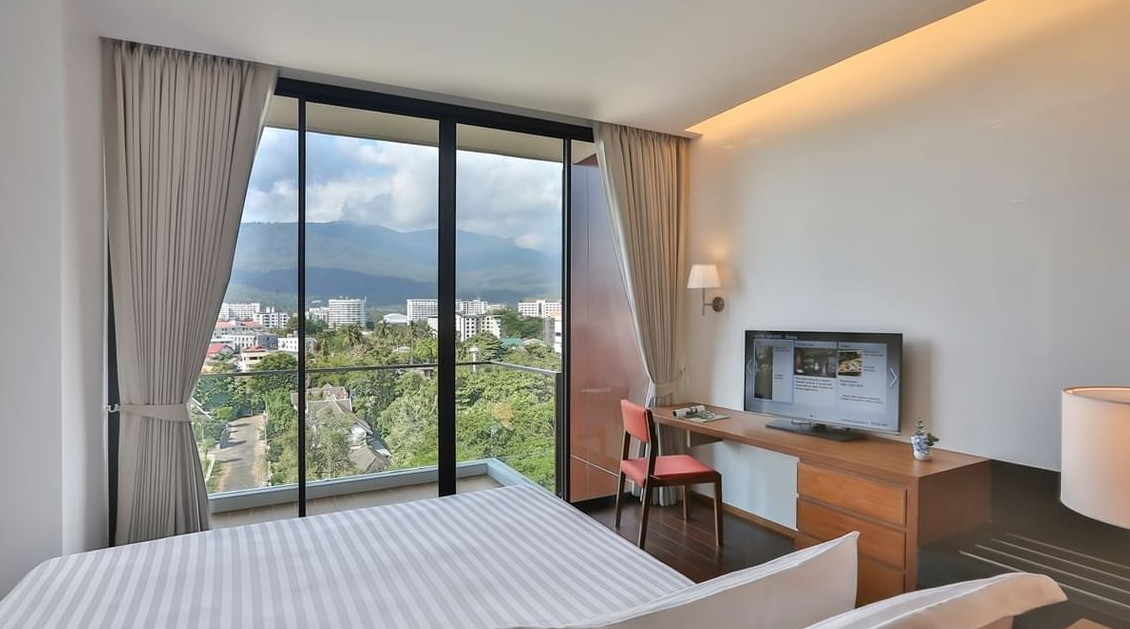 욕조가 딸린 1베드룸 스위트 마운틴 뷰 객실에서 편안하게 도이수텝의 멋진 전망을 포함하여 치앙마이의 아름다운 산의 탁 트인 전망을 즐겨보세요.
