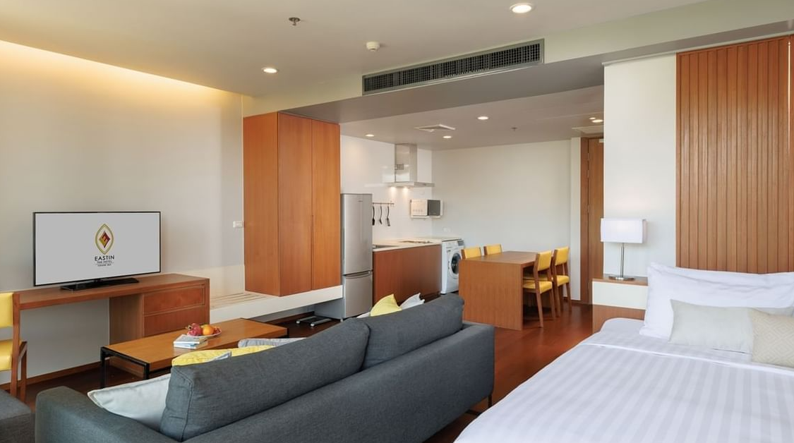 모든 객실에는 침실에서 프라이버시를 보호할 수 있는 별도의 거실이 있습니다. 기타 시설 및 편의 시설로는 별도의 샤워실과 욕조가 있는 대형 욕실, 고급 침구, 개별 조절식 에어컨, 국제 위성 채널이 편성된 LCD TV, Wi-Fi 인터넷 접속, 소형 식료품 저장실, 스토브, 잘 갖춰진 미니바, IDD 전화, 차/커피 메이커, 헤어드라이어 및 객실 내 안전 금고를 갖추고 있습니다. 킹 사이즈 침대만 이용 가능합니다.