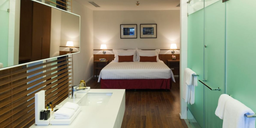 욕조가 있는 모든 1베드룸 스위트에는 침실에서 추가적인 프라이버시를 제공하는 별도의 거실이 포함되어 있습니다.