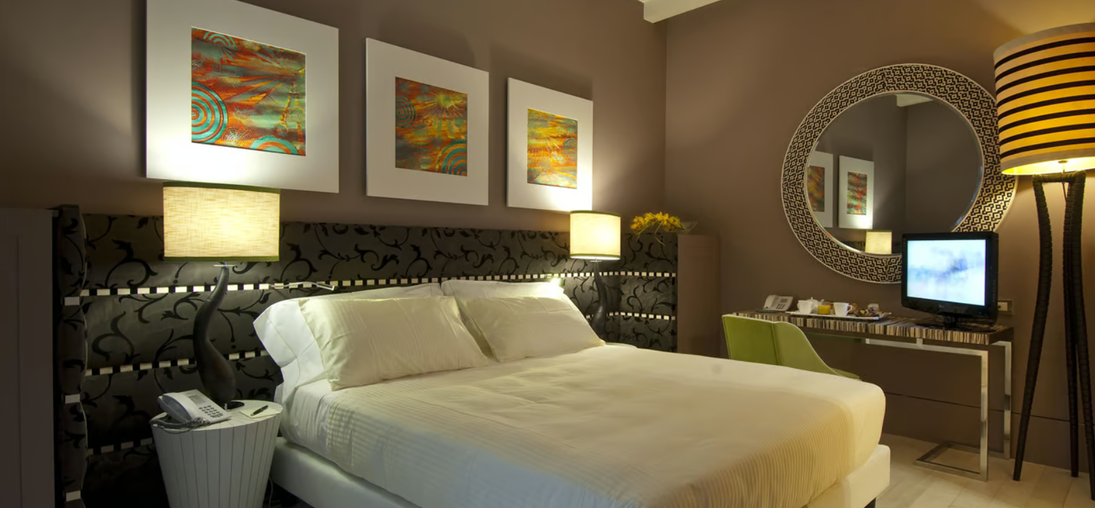 스탠다드 룸은 현대적이고 편안하며 샤워 시설 또는 욕조를 갖춘 아름다운 금색 타일 욕실을 갖추고 있습니다. 더블 또는 트윈 침대가 마련되어 있으며, 후자는 1인용으로 사용됩니다.