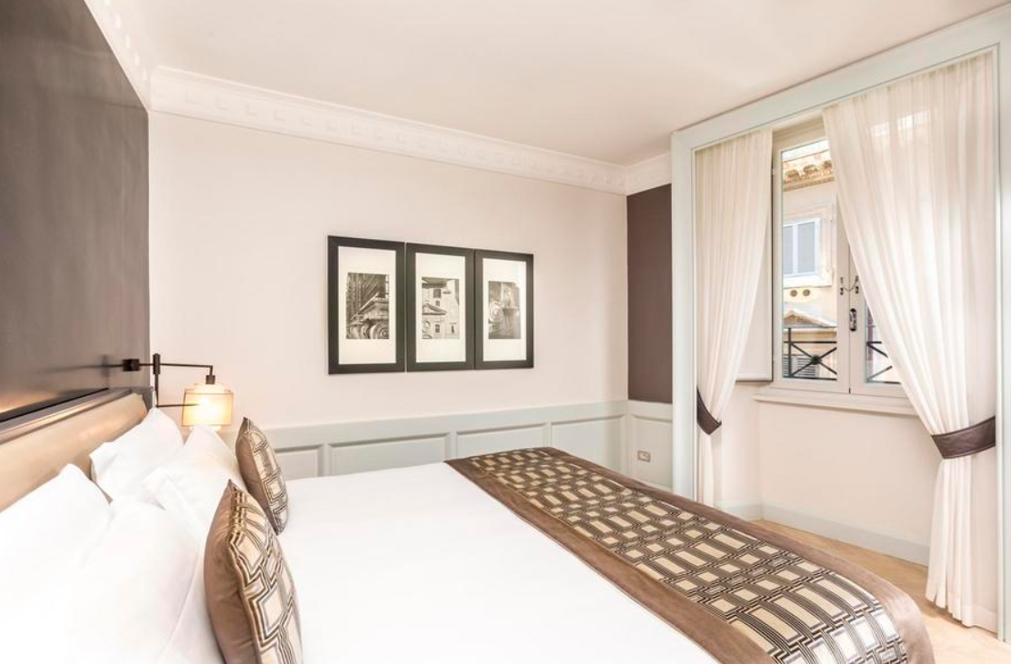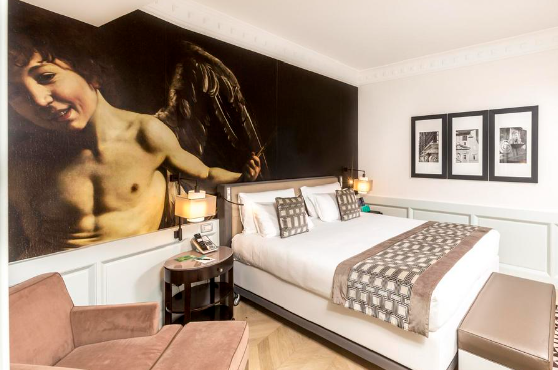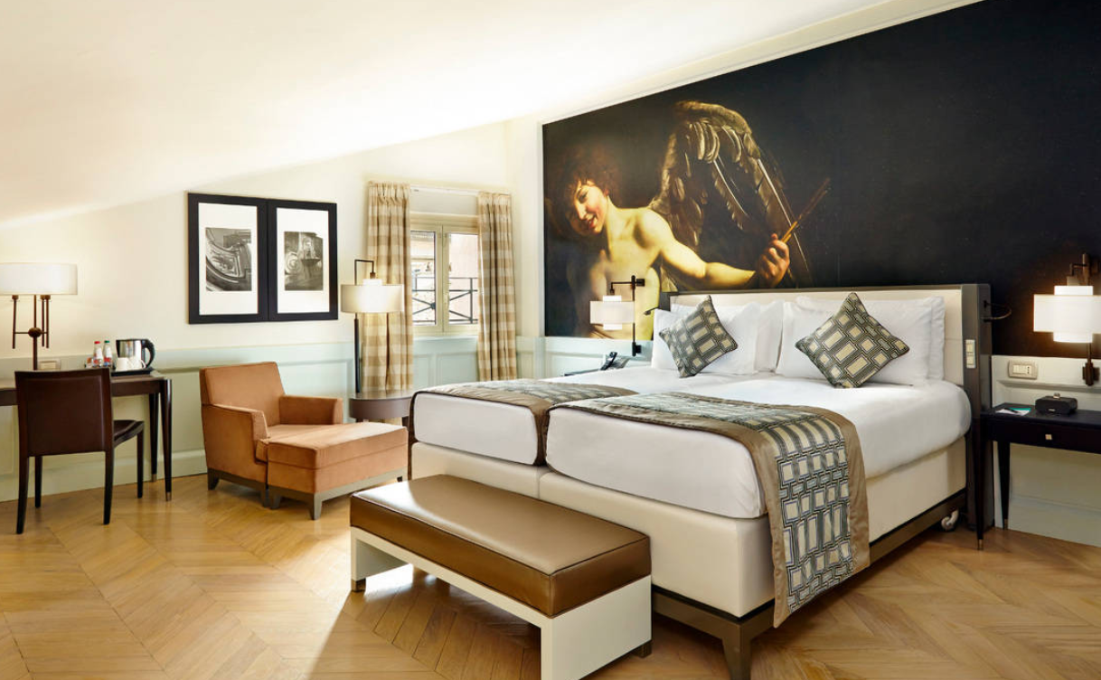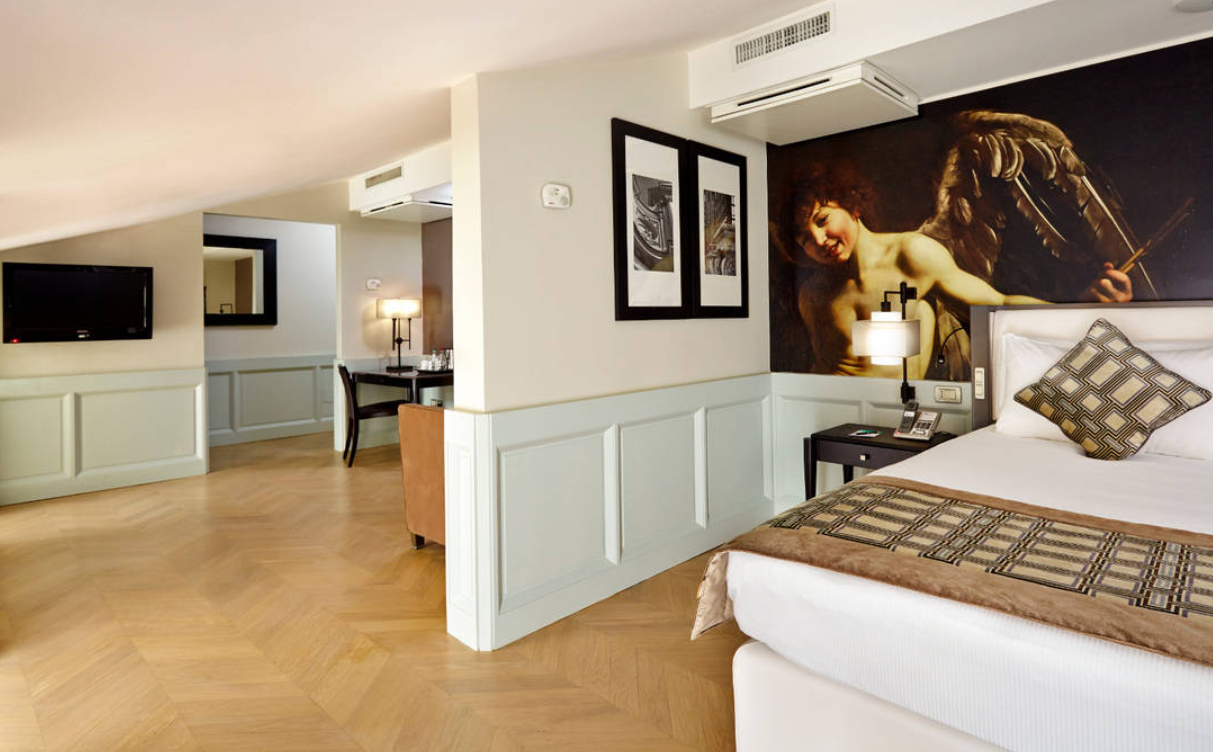 로마의 심장부에서 비할 데 없는 경험을 위해, Executive Suite는 공간, 편안함, 독점적인 편의 시설이 완벽하게 조화를 이룬 곳입니다. 카라바조의 유명한 그림 "Amor Vincit Omnia"에서 영감을 받은 세련된 Executive Suite 는 비둘기 회색의 따뜻한 톤으로 장식되어 있습니다.