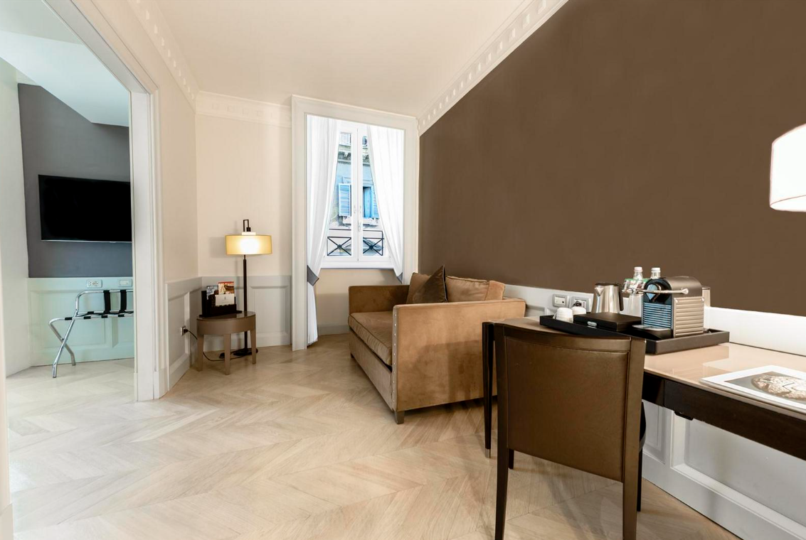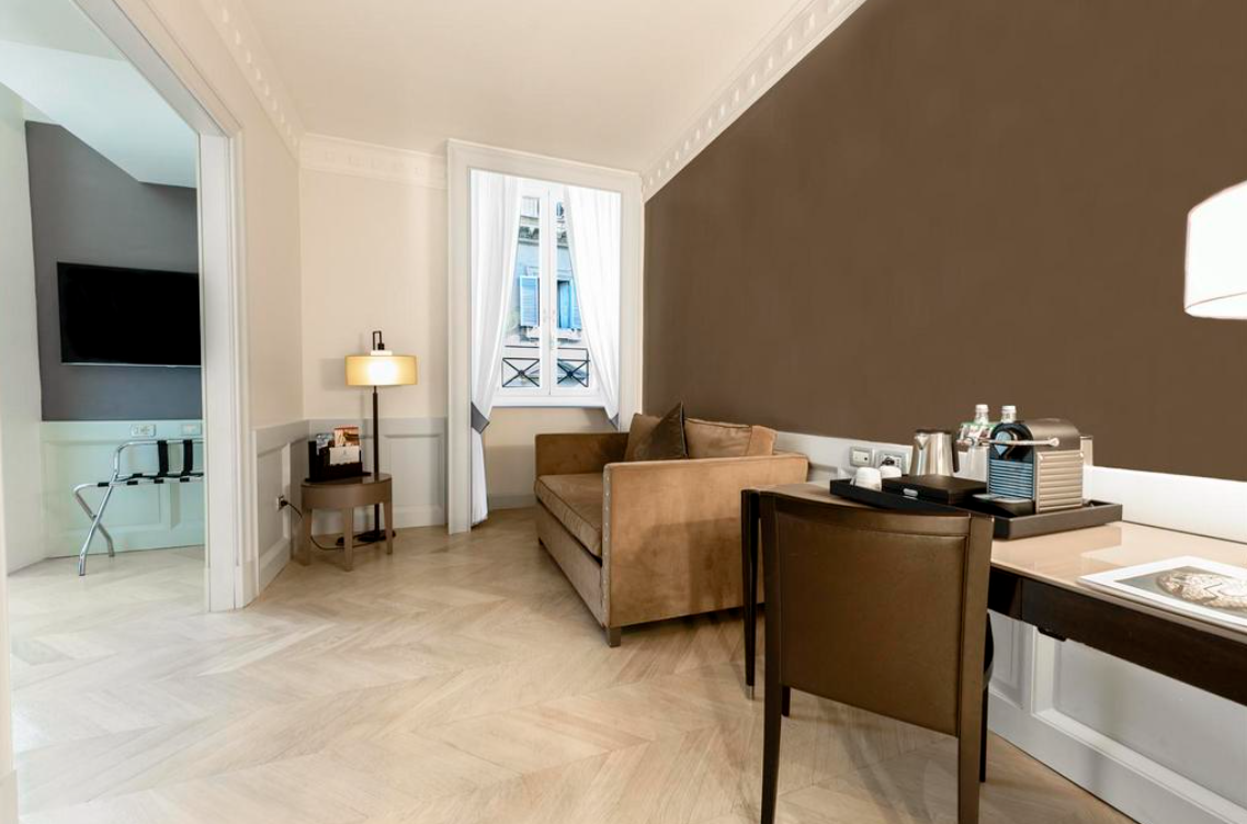 카라바조의 유명한 그림 "Amor Vincit Omnia"에서 영감을 받은, 비둘기 회색의 따뜻한 톤으로 장식된 세련된 주니어 스위트는 충분한 공간과 편안함을 추구하는 사람들에게 완벽한 선택입니다. 총 35smq/377sq ft. 의 주니어 스위트는 더블 룸(킹 사이즈 침대)과 소파 베드(2인용 퀸 사이즈)가 있는 거실로 구성되어 있어, 아주 어린 자녀 두 명을 둔 부부에게 이상적입니다.