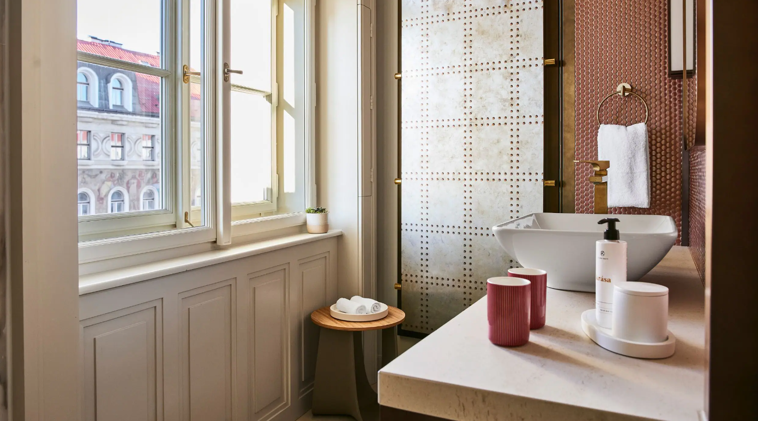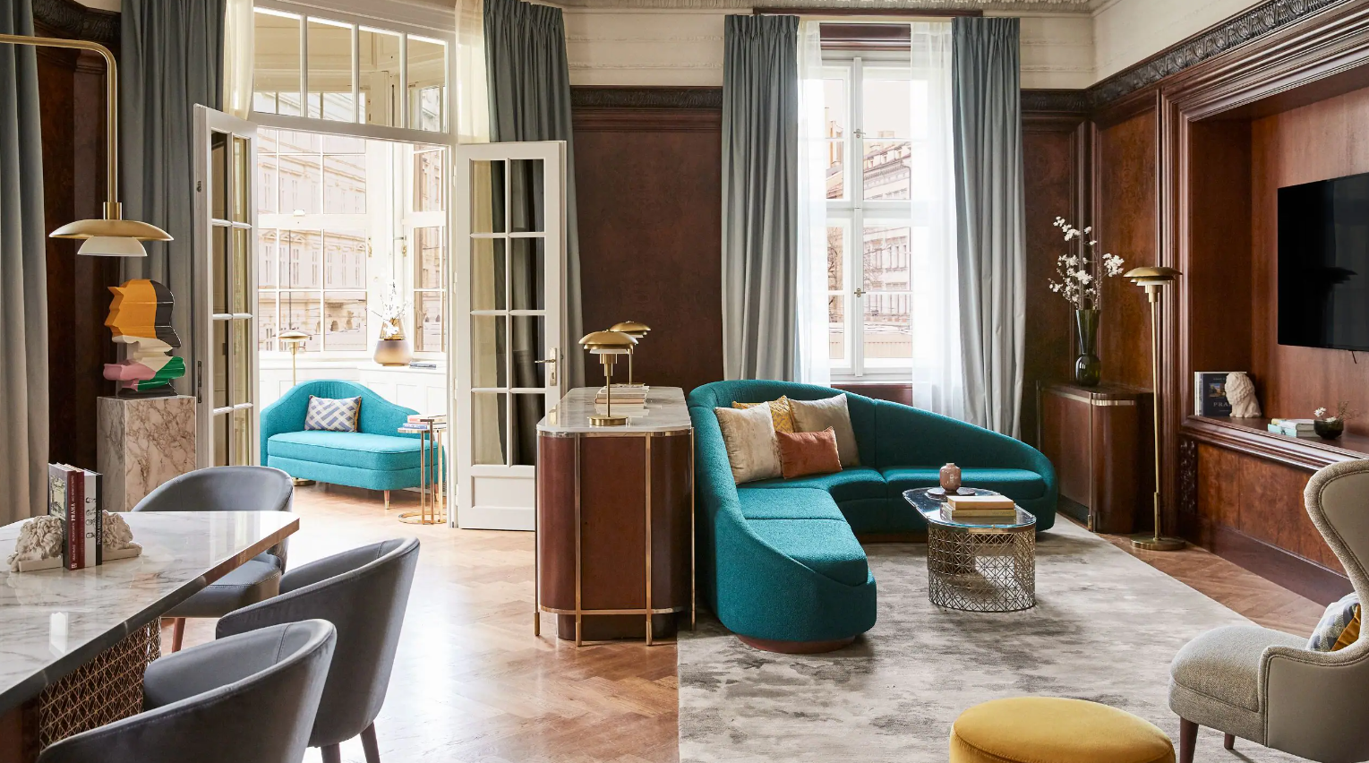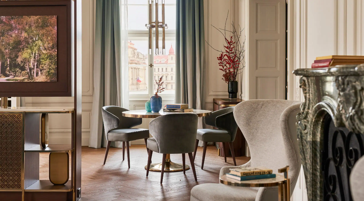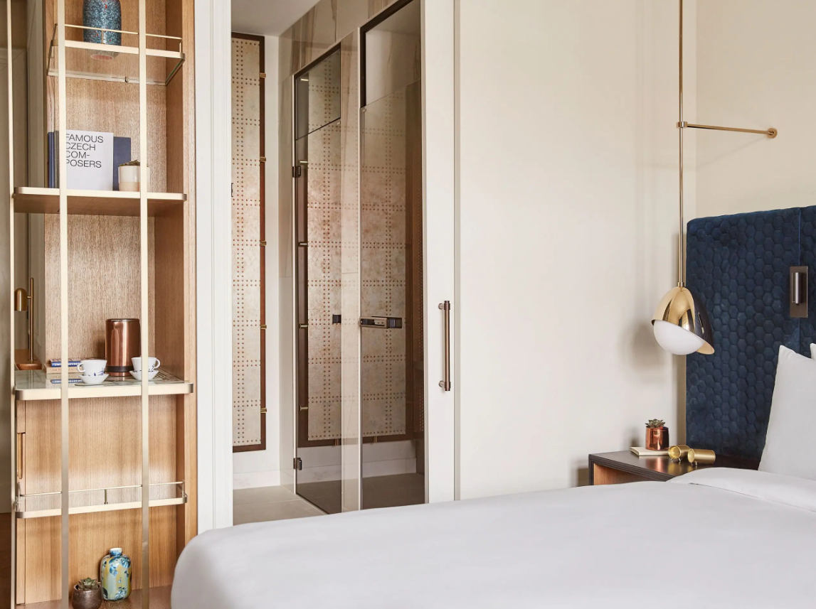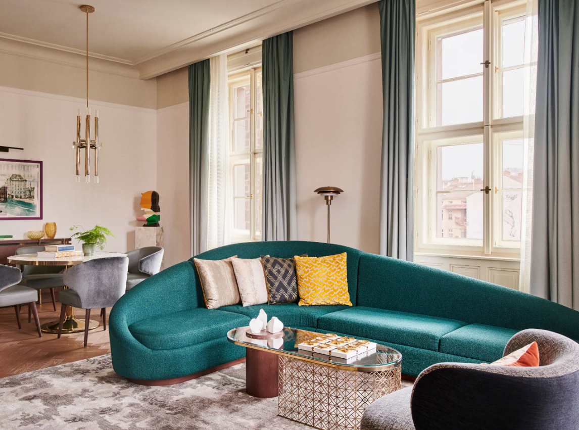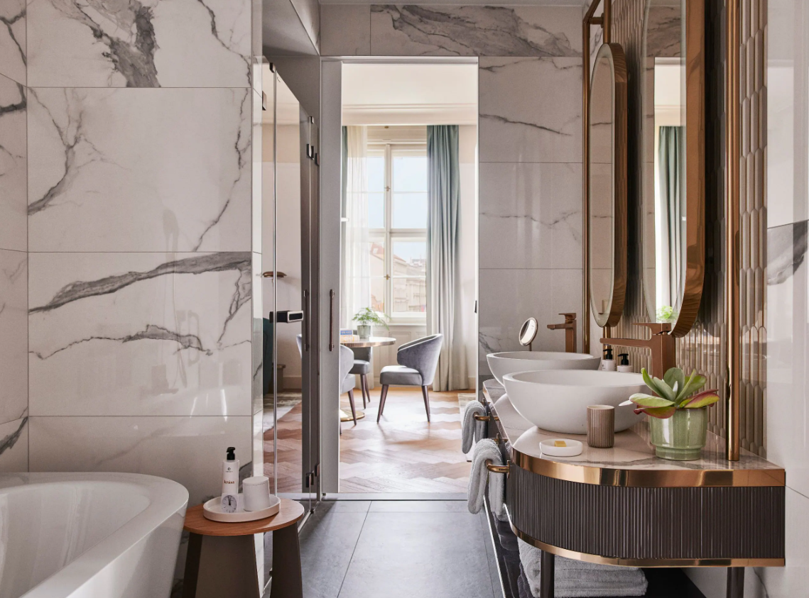 Dancing Fountain이 내려다보이는 이 럭셔리 스위트에서 웅장한 목재 패널, 빈티지 벽 몰딩, 높은 천장으로 프라하의 유산에 푹 빠져보세요. 각 스위트는 시간을 거슬러 올라가는 듯한 독특한 디자인을 선보이며 별도의 거실, 식사 공간, 책상, 킹 침실, 멋진 겨울 정원, 욕조와 샤워 시설이 있는 넓고 밝은 욕실을 갖추고 있습니다.