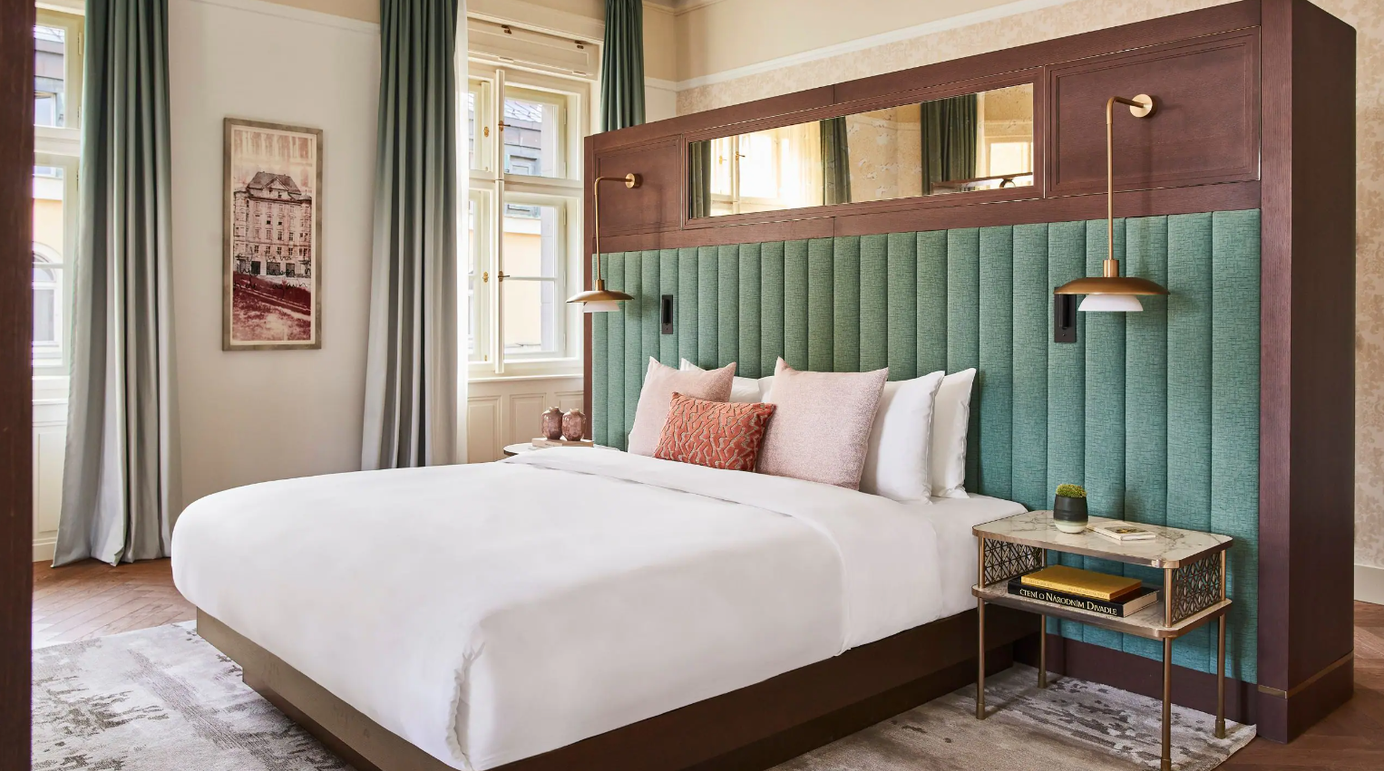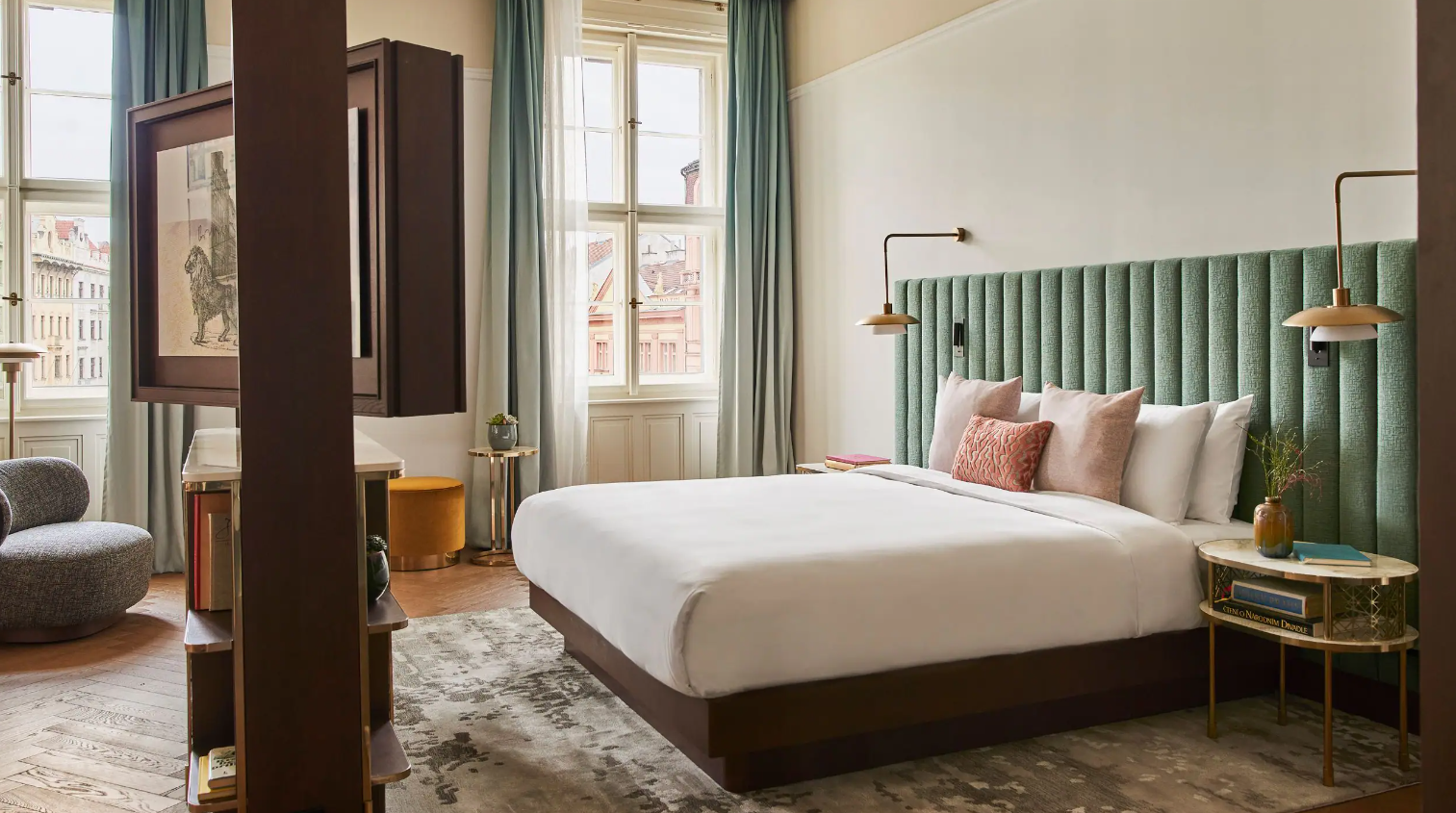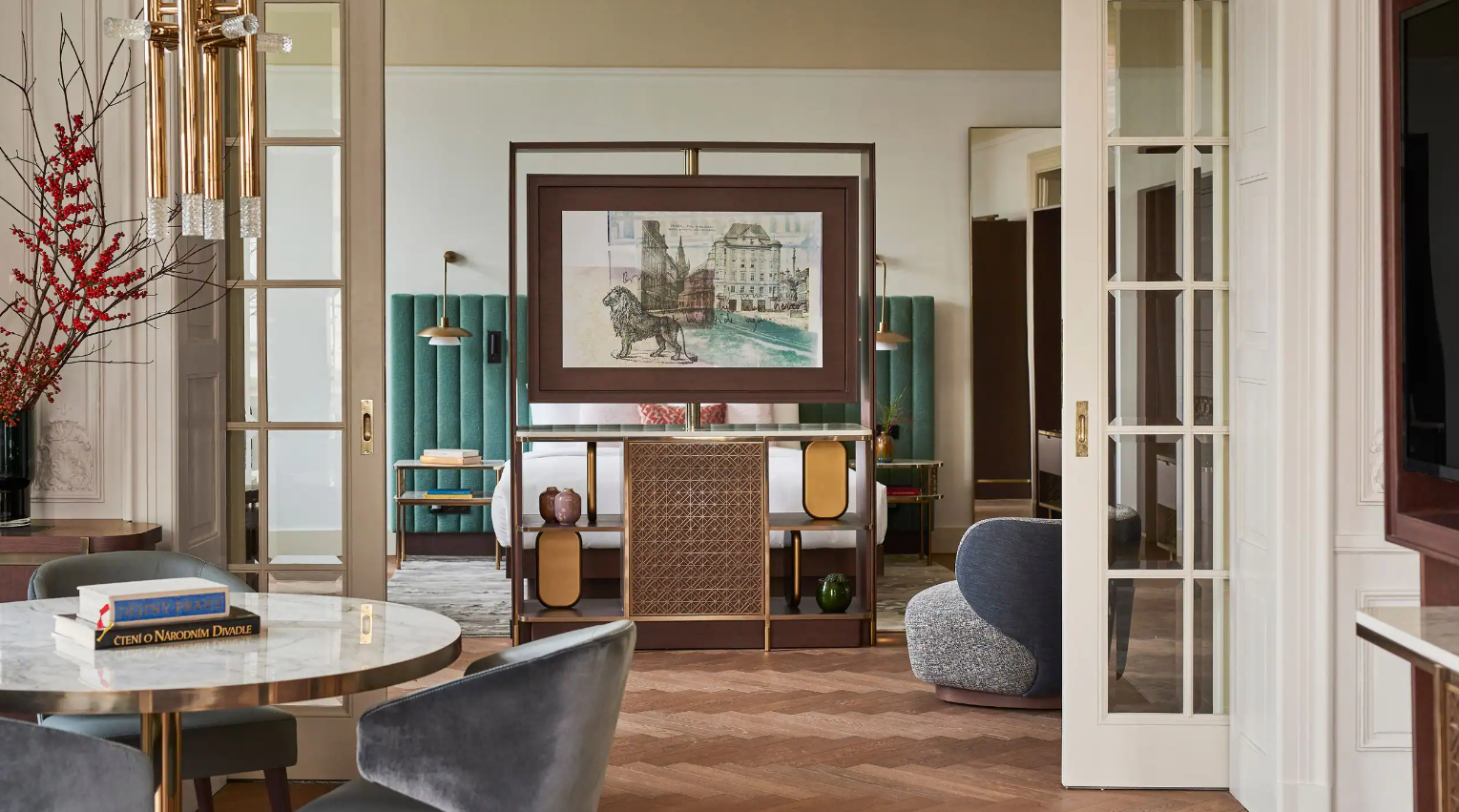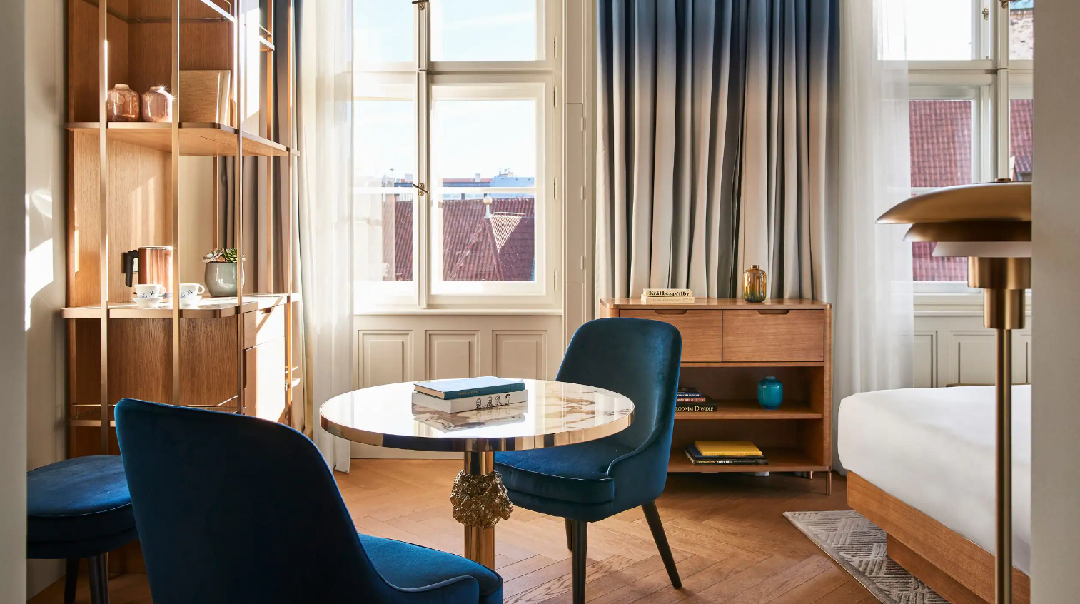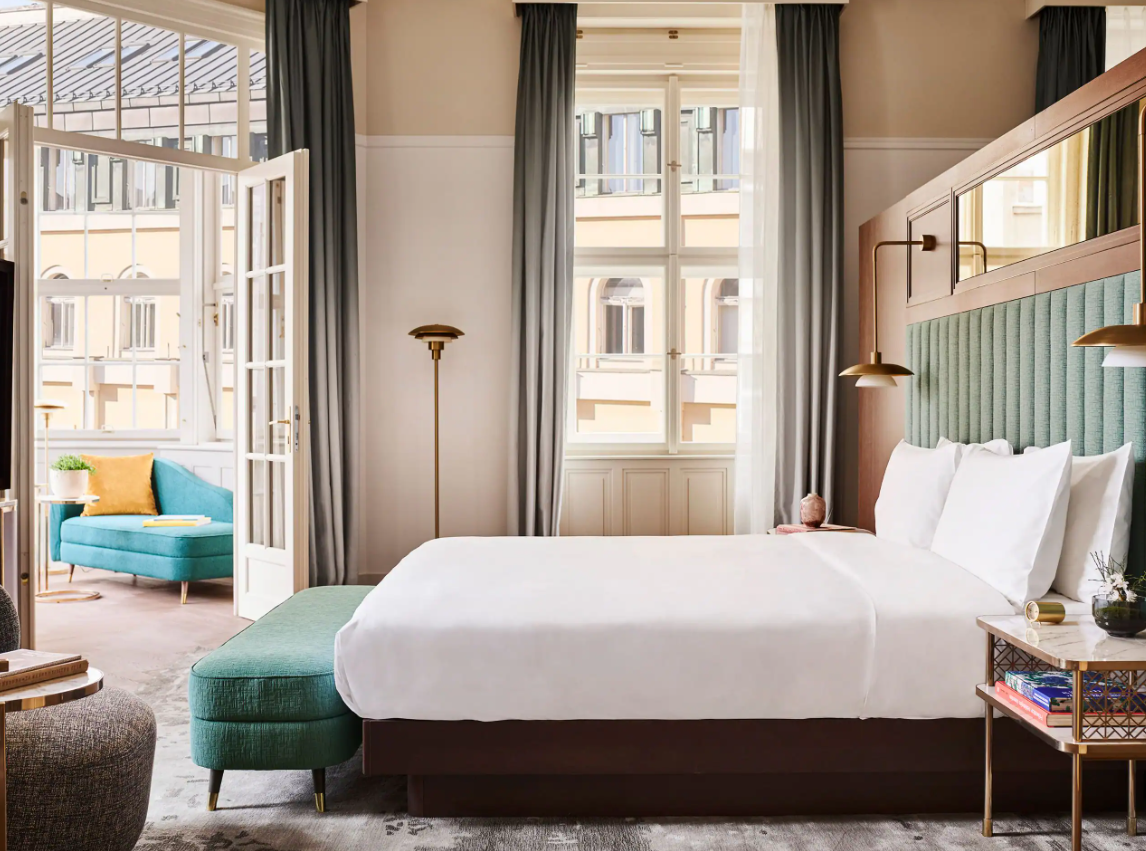 Dancing Fountain이 내려다보이는 이 럭셔리 스위트에서 웅장한 목재 패널, 빈티지 벽 몰딩, 높은 천장으로 프라하의 유산에 푹 빠져보세요. 각 스위트는 시간을 거슬러 올라가는 듯한 독특한 디자인을 선보이며 별도의 거실, 식사 공간, 책상, 킹 침실, 멋진 겨울 정원, 욕조와 샤워 시설이 있는 넓고 밝은 욕실을 갖추고 있습니다.