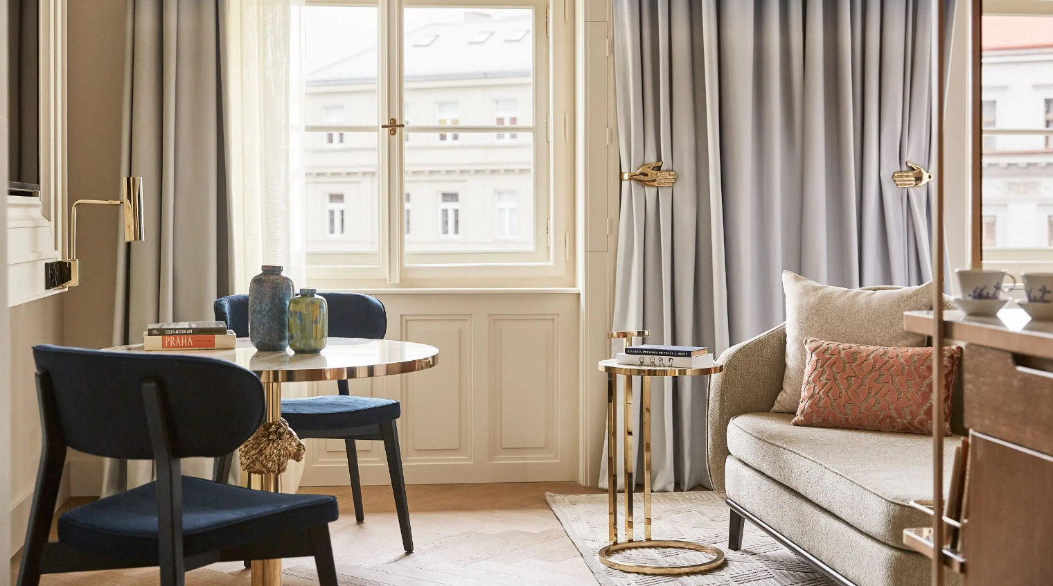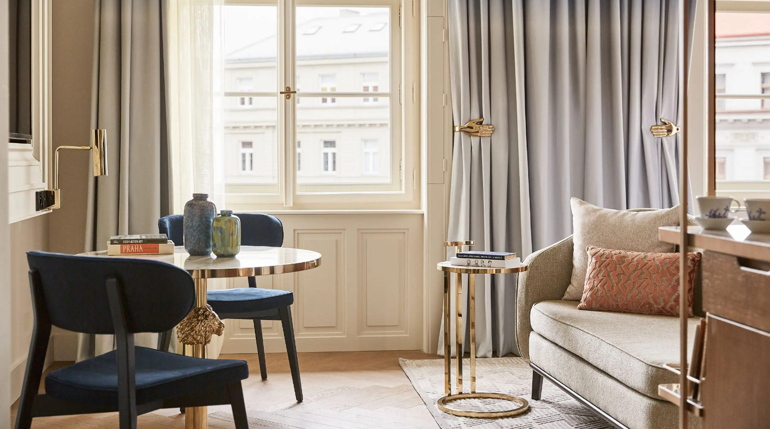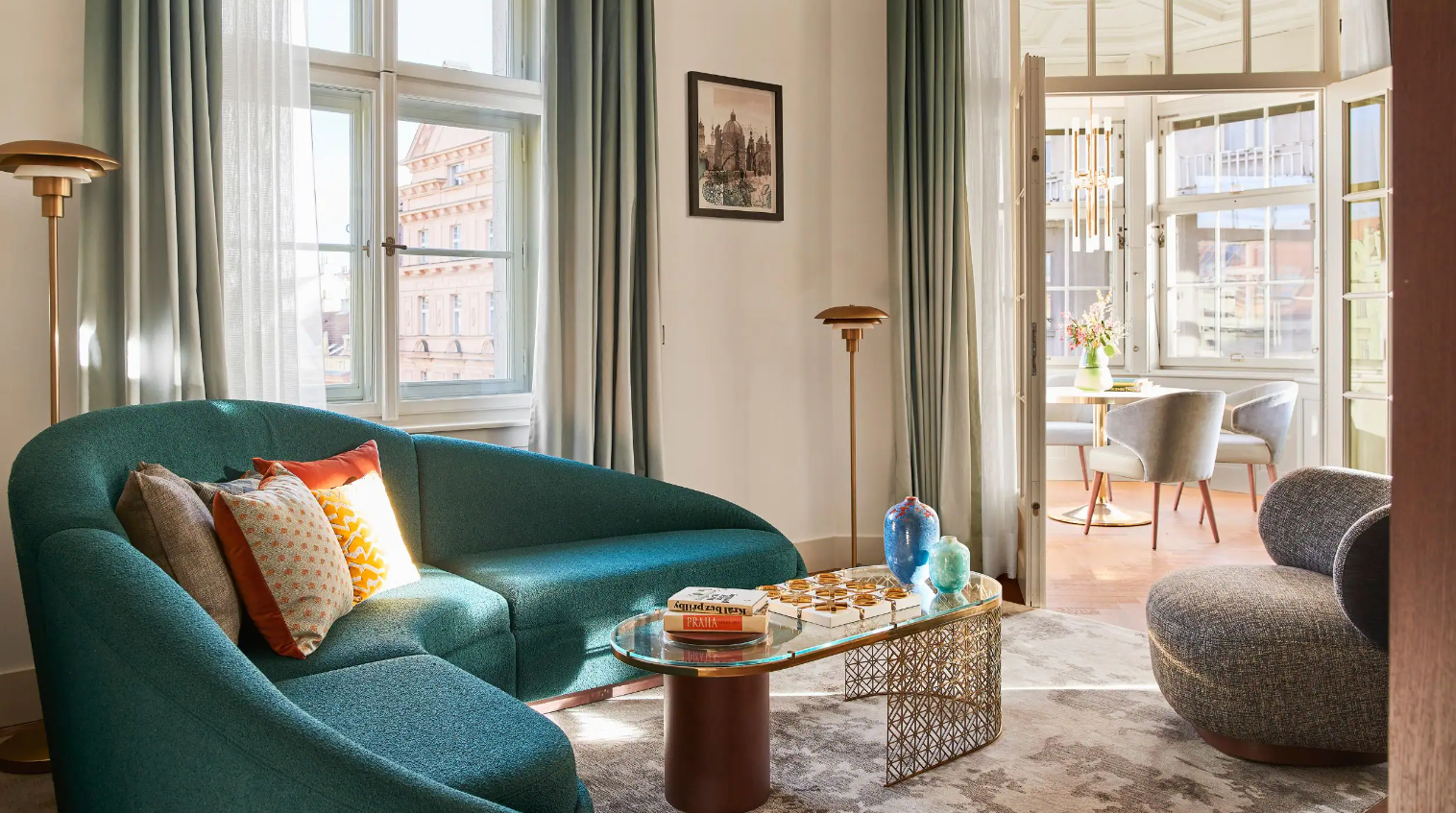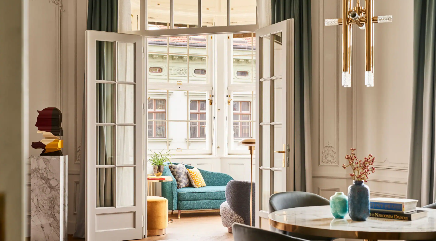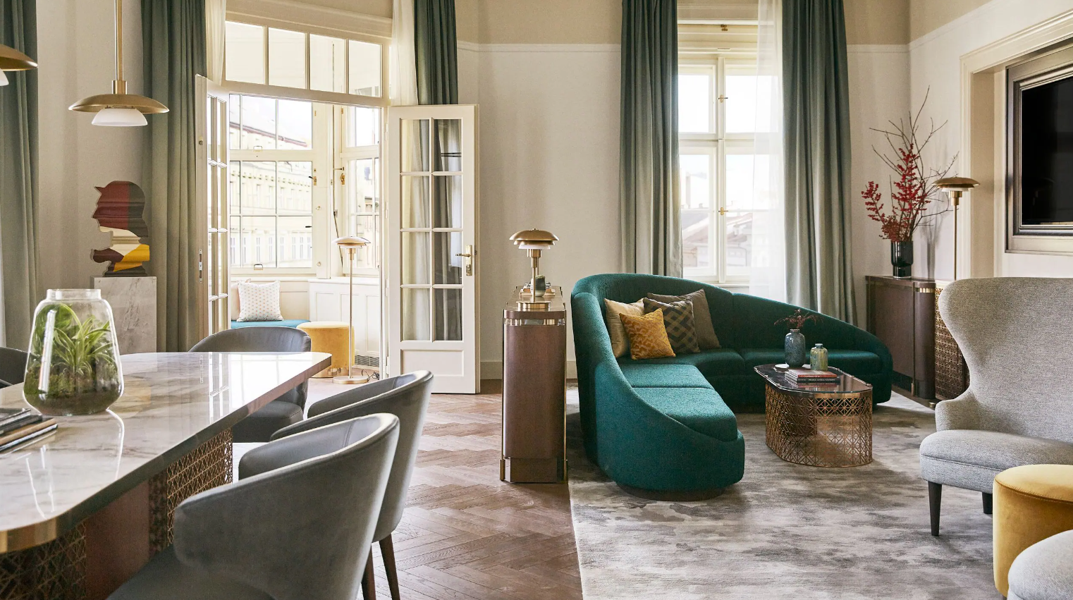Dancing Fountain이 내려다보이는 이 럭셔리 스위트에서 웅장한 목재 패널, 빈티지 벽 몰딩, 높은 천장으로 프라하의 유산에 푹 빠져보세요. 각 스위트는 시간을 거슬러 올라가는 듯한 독특한 디자인을 선보이며 별도의 거실, 식사 공간, 책상, 킹 침실, 멋진 겨울 정원, 욕조와 샤워 시설이 있는 넓고 밝은 욕실을 갖추고 있습니다.