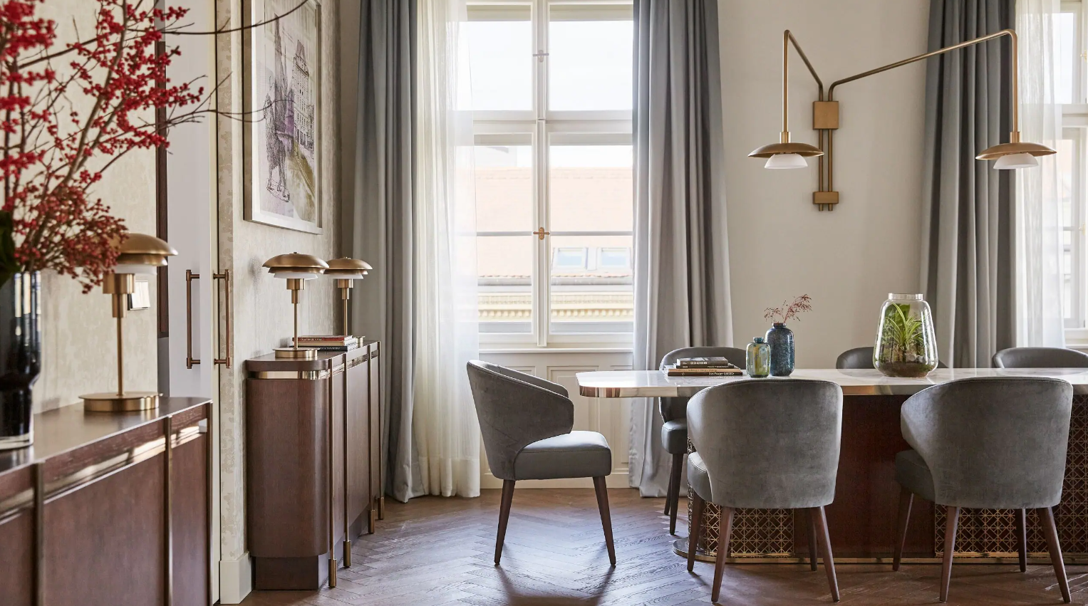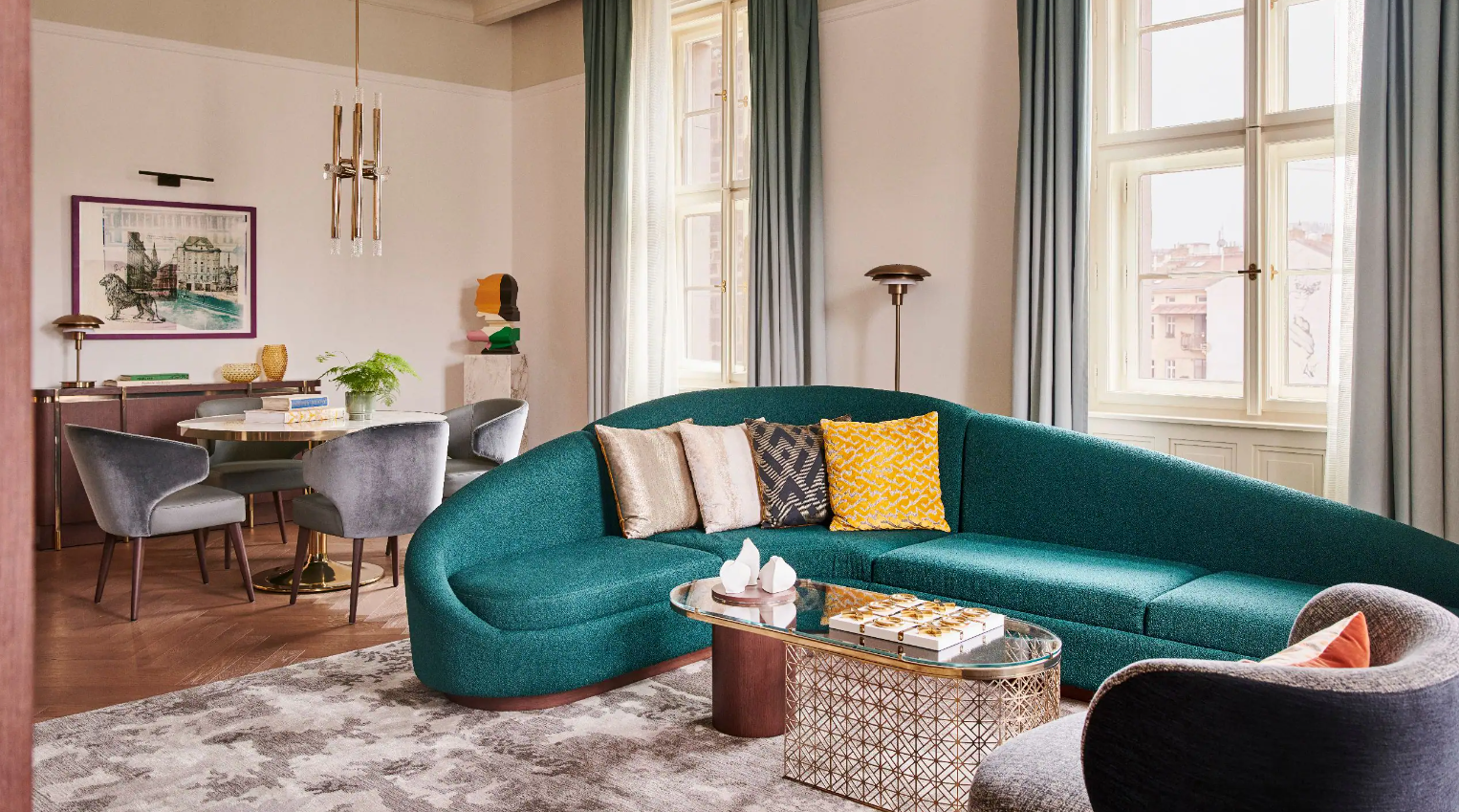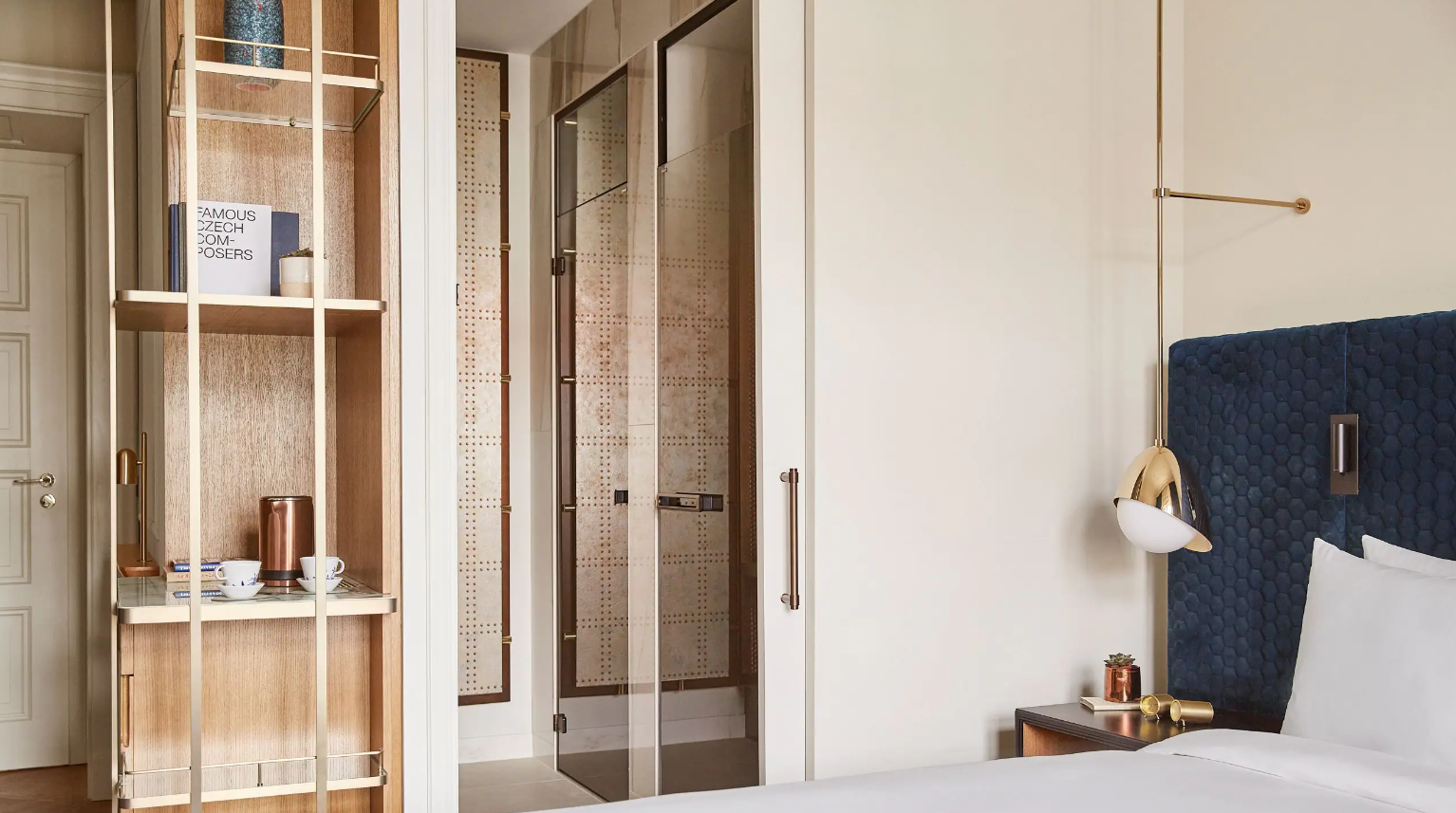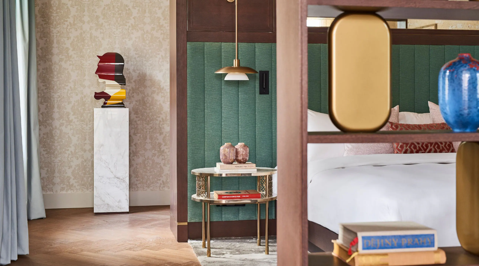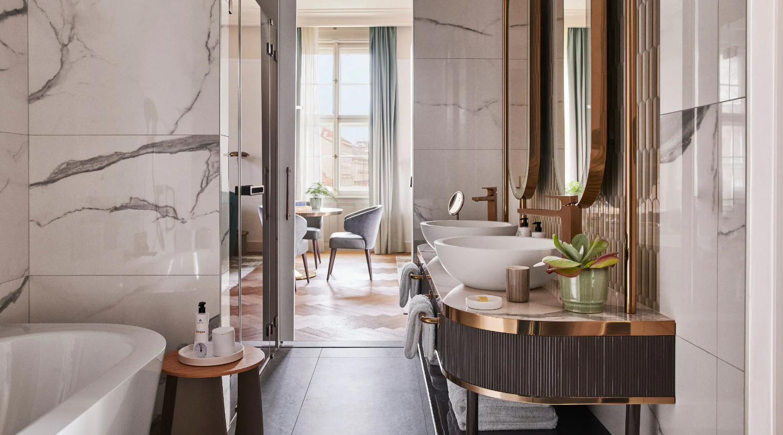 Dancing Fountain이 내려다보이는 이 럭셔리 스위트에서 웅장한 목재 패널, 빈티지 벽 몰딩, 높은 천장으로 프라하의 유산에 푹 빠져보세요. 각 스위트는 시간을 거슬러 올라가는 듯한 독특한 디자인을 선보이며 별도의 거실, 식사 공간, 책상, 킹 침실, 멋진 겨울 정원, 욕조와 샤워 시설이 있는 넓고 밝은 욕실을 갖추고 있습니다.