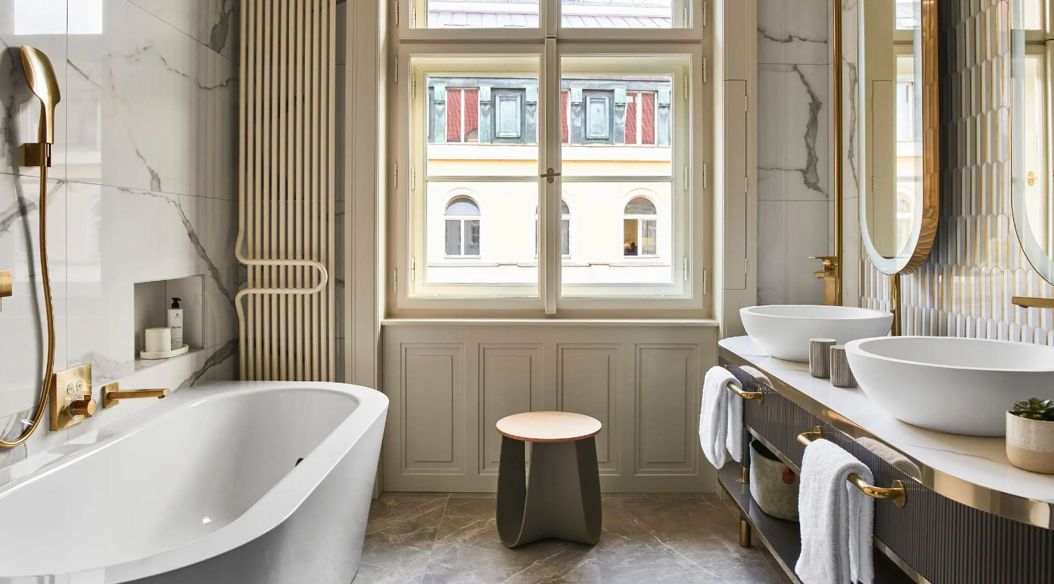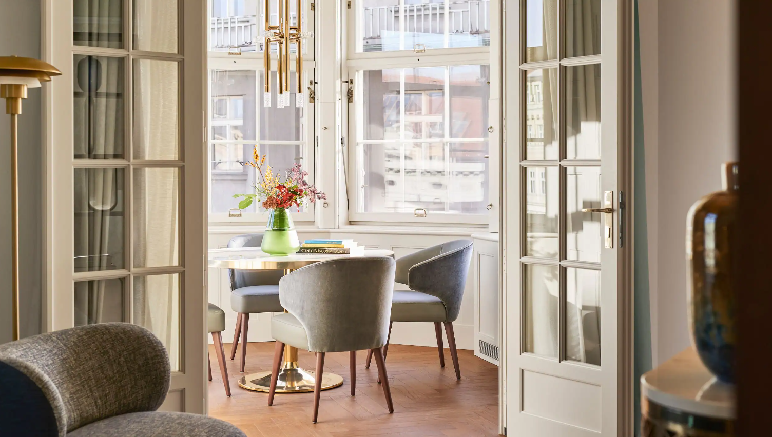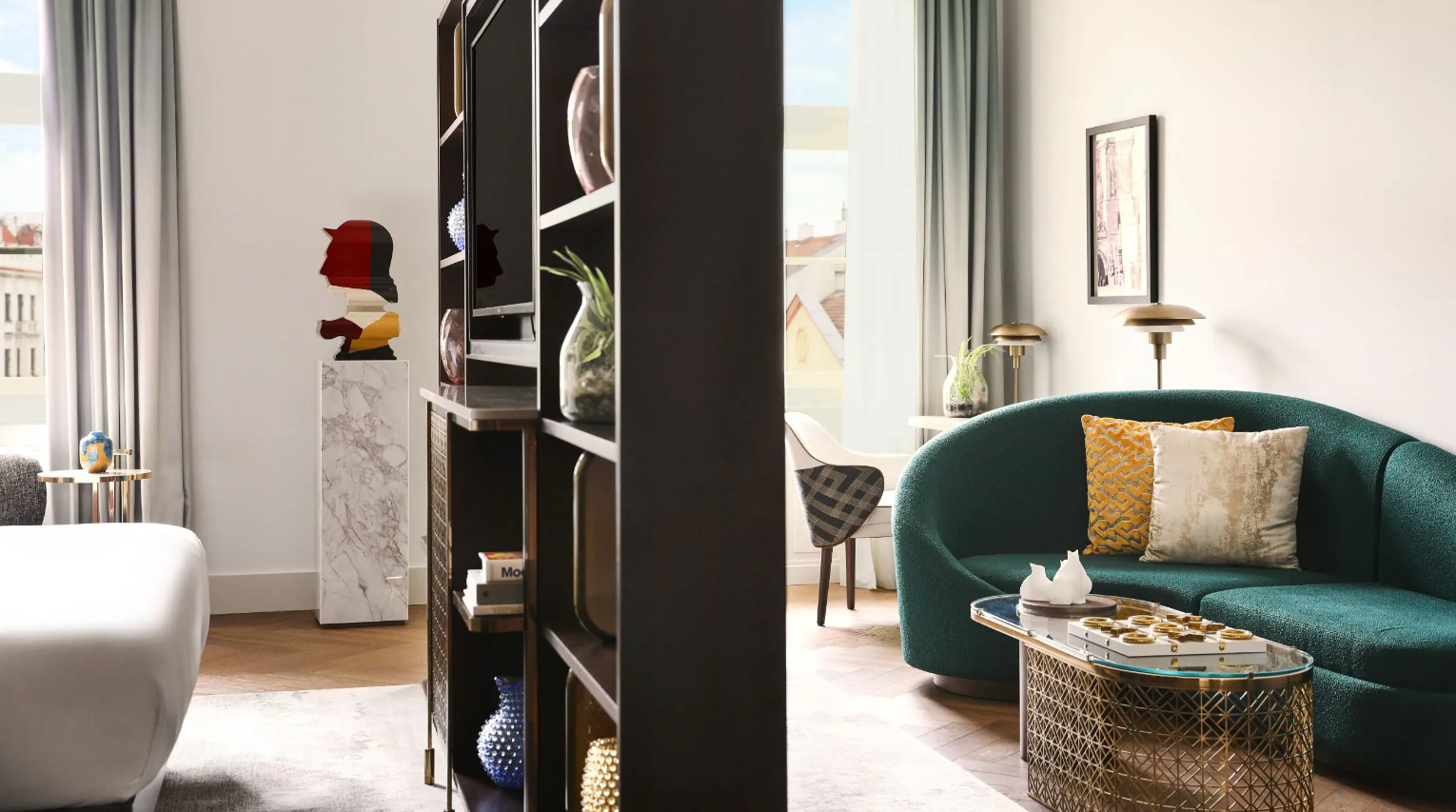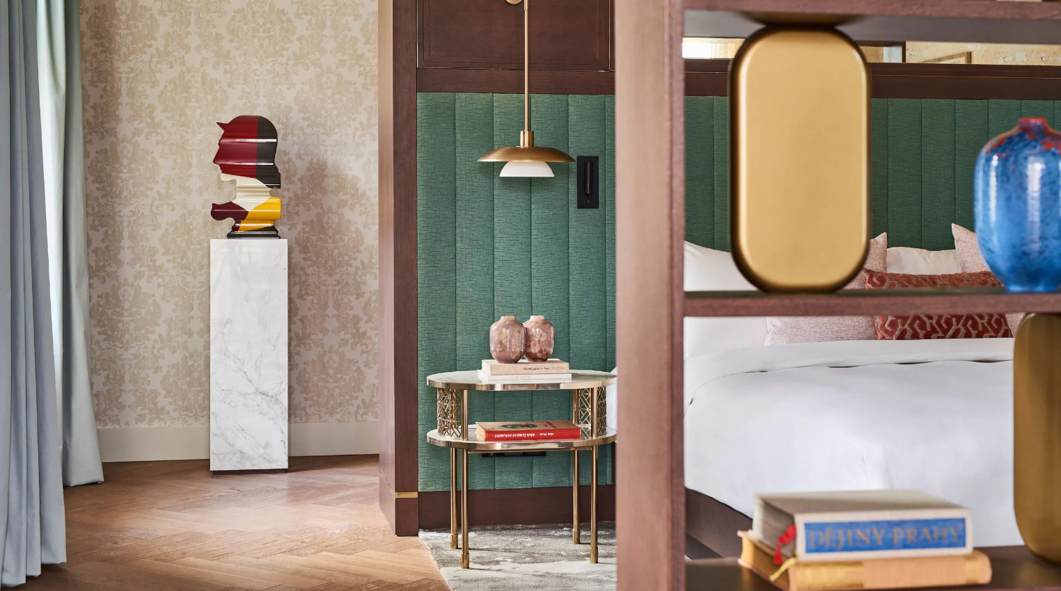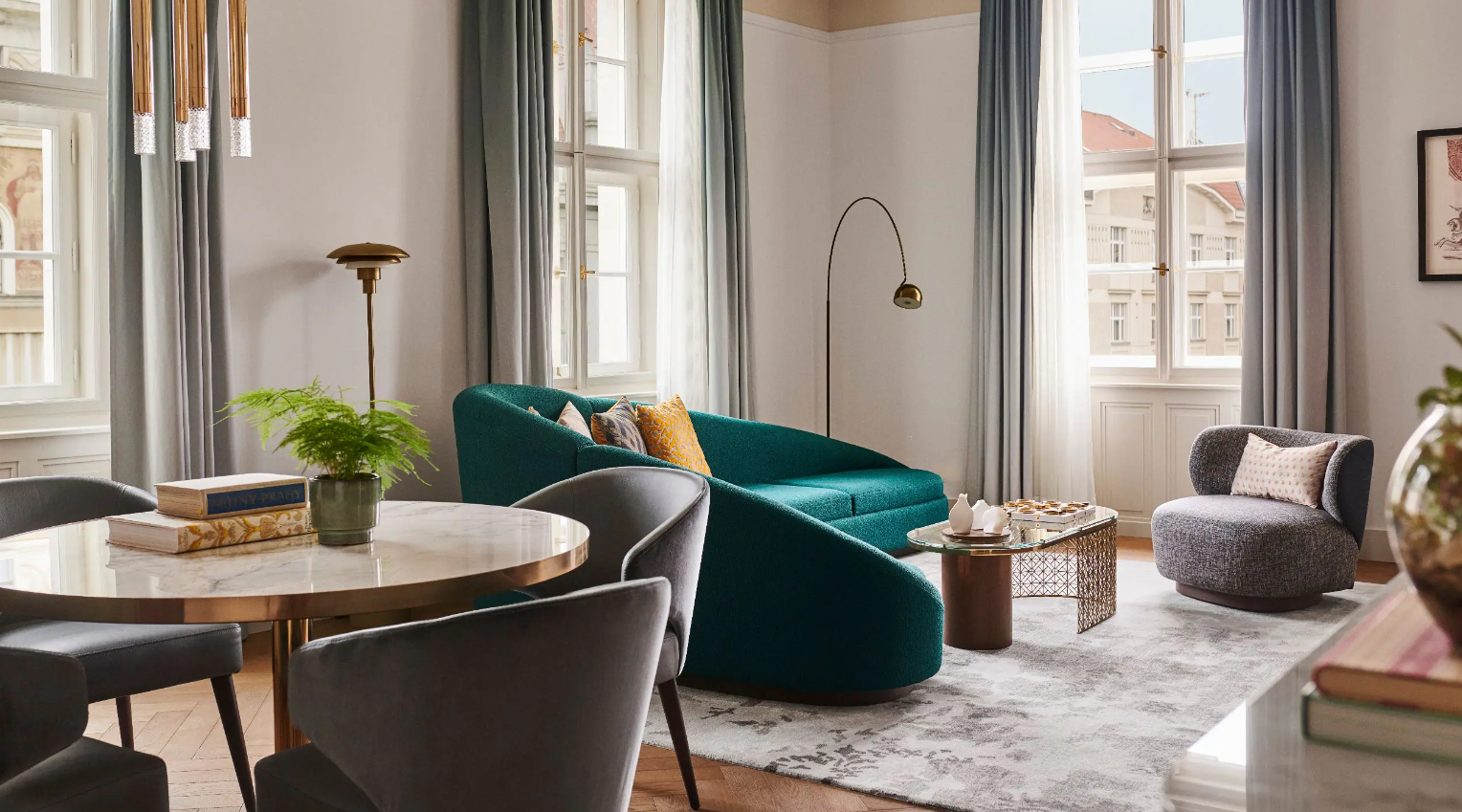 Dancing Fountain이 내려다보이는 이 럭셔리 스위트에서 웅장한 목재 패널, 빈티지 벽 몰딩, 높은 천장으로 프라하의 유산에 푹 빠져보세요. 각 스위트는 시간을 거슬러 올라가는 듯한 독특한 디자인을 선보이며 별도의 거실, 식사 공간, 책상, 킹 침실, 멋진 겨울 정원, 욕조와 샤워 시설이 있는 넓고 밝은 욕실을 갖추고 있습니다.