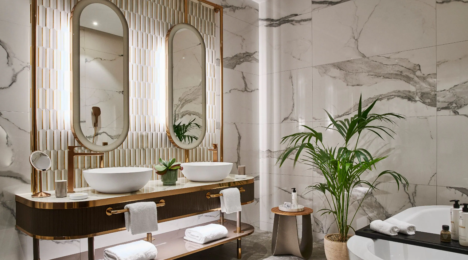 이 넓은 스위트에서 우아한 겨울 정원에서 디바처럼 느껴보세요. 이 스위트는 유산과 아르 데코 디자인의 영향을 받아 현대적인 사치와 세련미를 구현합니다. 원래 킹 침실은 1930년대에 실버 스크린 스타 아디나 만드로바가 그녀의 전용 부도아르로 디자인했습니다. 대형 소파, 의자, 8인용 대리석 식탁이 있는 별도의 거실과 Dancing Fountain의 전망을 즐겨보세요. 실내 욕실에는 대형 욕조, 샤워 시설, 고급 세면용품이 있습니다. 추가 편의 시설로는 일부 지역 간식과 음료가 있는 무료 미니바와 캐스팅 옵션이 있는 평면 TV가 있습니다.